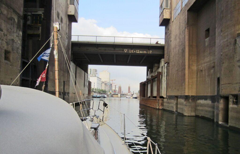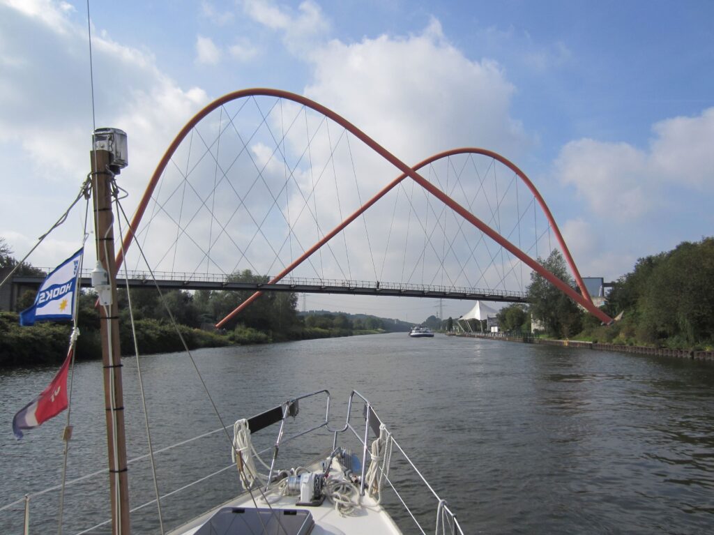 Als nächstes folgen die Schleusen Wanne-Eickel, Gelsenkirchen und Oberhausen, die alle mit Schwimmpollern ausgerüstet sind, eine wirklich sinnvolle Sache für uns Sportschiffer. Einmal festgemacht mit Vorspring und Achterspring, dann geht es rauf oder runter, ohne einmal die Leinen umlegen zu müssen.