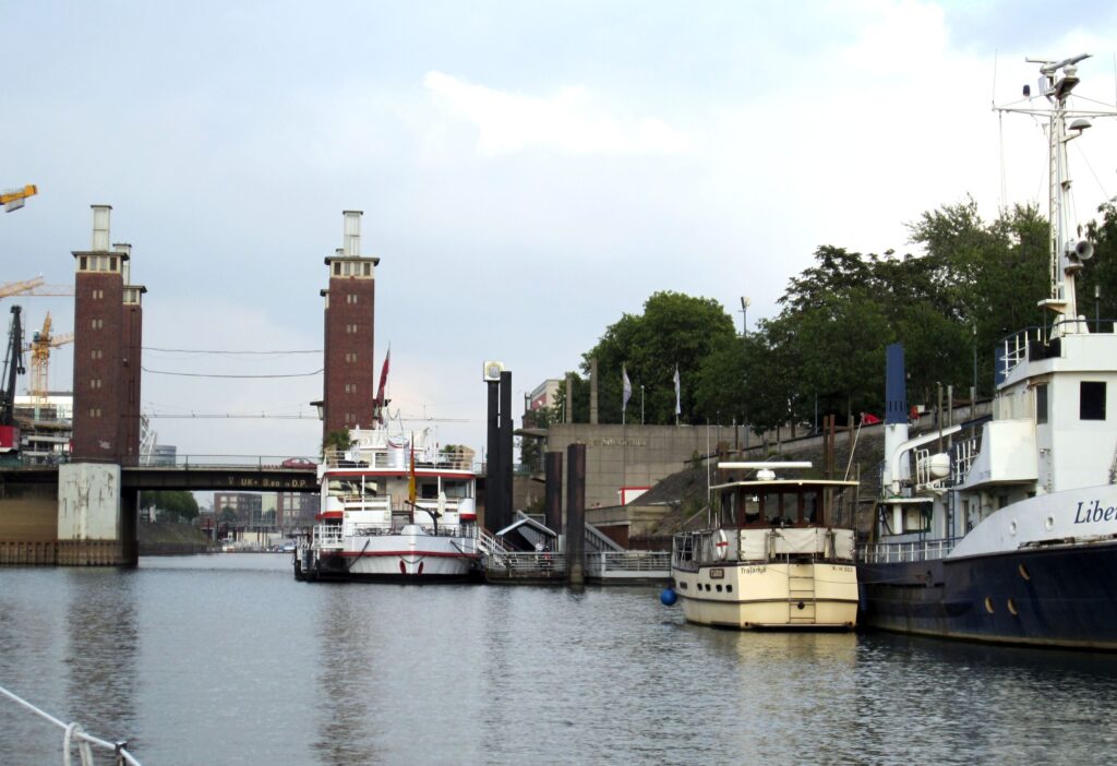Wir laufen in den Hafen Duisburg ein. Die Einfahrt ist in einer Kurve, man nicht sieht, ob ein Berufsschiff entgegenkommt. Auch hier hätten wir uns über Kanal 10 melden sollen … lassen uns aber von einem Schild irritieren, wo was von Kanal 14 und „beim Hafenmeister melden“ usw., steht.