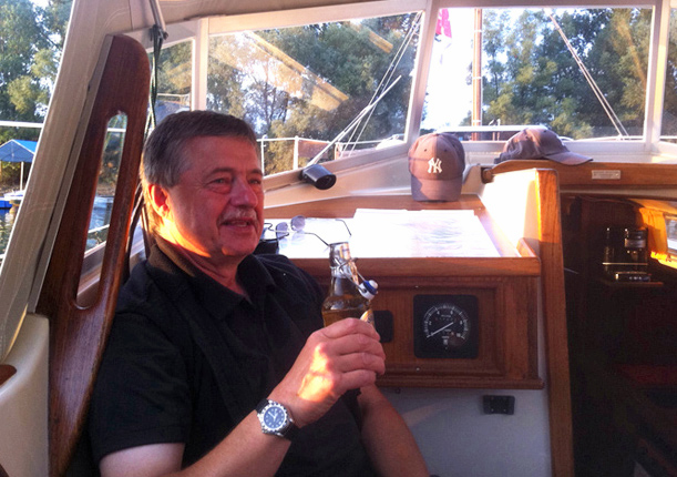 Zuerst unterhalte ich die Beiden ein wenig, da Wolfgang im Hafen half, ein Boot nach vorn zu ziehen. Auf einmal rief er vom Steg: „Ich komme gleich“ Was war passiert? Wolfgang erkundete die Wassertemperatur und nahm ein unfreiwilliges Bad. Beim Überwerfen der Halteleine über eine Antenne kippte er zwischen dem Fingersteg und Boot ins Wasser.