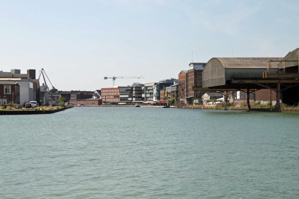 Der Münsteraner Stadthafen, so toll sieht das alles hier nicht aus, zumal überall am Kanal hier in Münster ein großes Naherholungsgebiet zu sein scheint. Wir müssen ziemlich langsam fahren, dass die Schwimmer uns nicht in die Quere kommen.