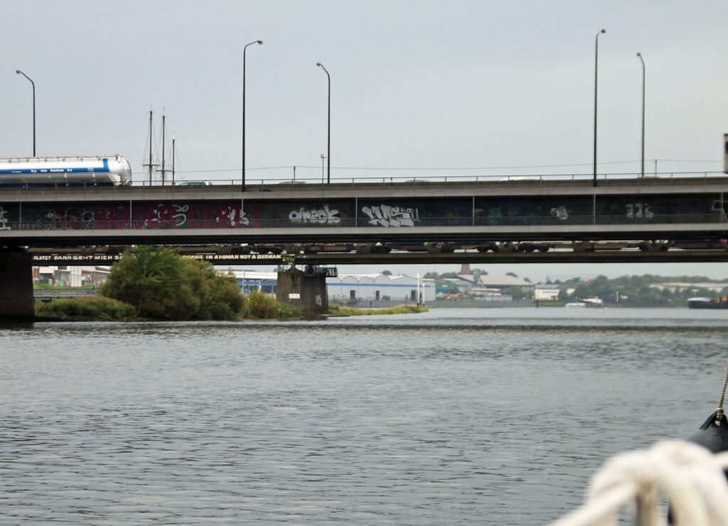 Ab der nahen Eisenbahnbrücke beginnt die Unterweser. Ab dort ist die Binnenschifffahrt zu Ende und die Seeschifffahrtsordnung ist für uns wieder gültig.