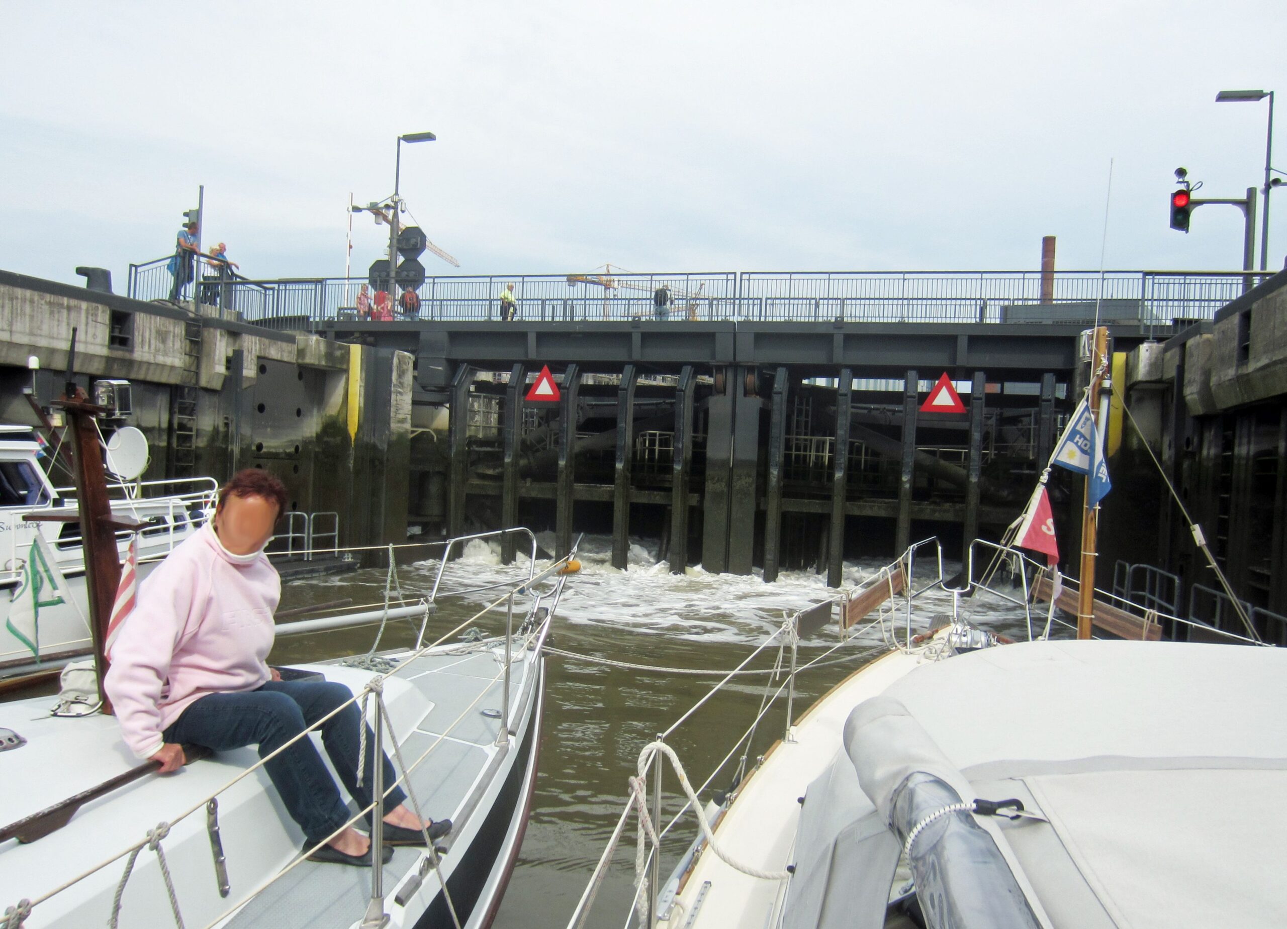 Ganz schön schnell schießt das Wasser in die Schleuse zum „Neuen Hafen“, wenn der Wasserstand innen und außen sehr unterschiedlich ist. Wir hatten extra weit vorne fest gemacht, damit noch ein großes Schiff hinter uns passt – aber nein, es macht BB an uns fest.