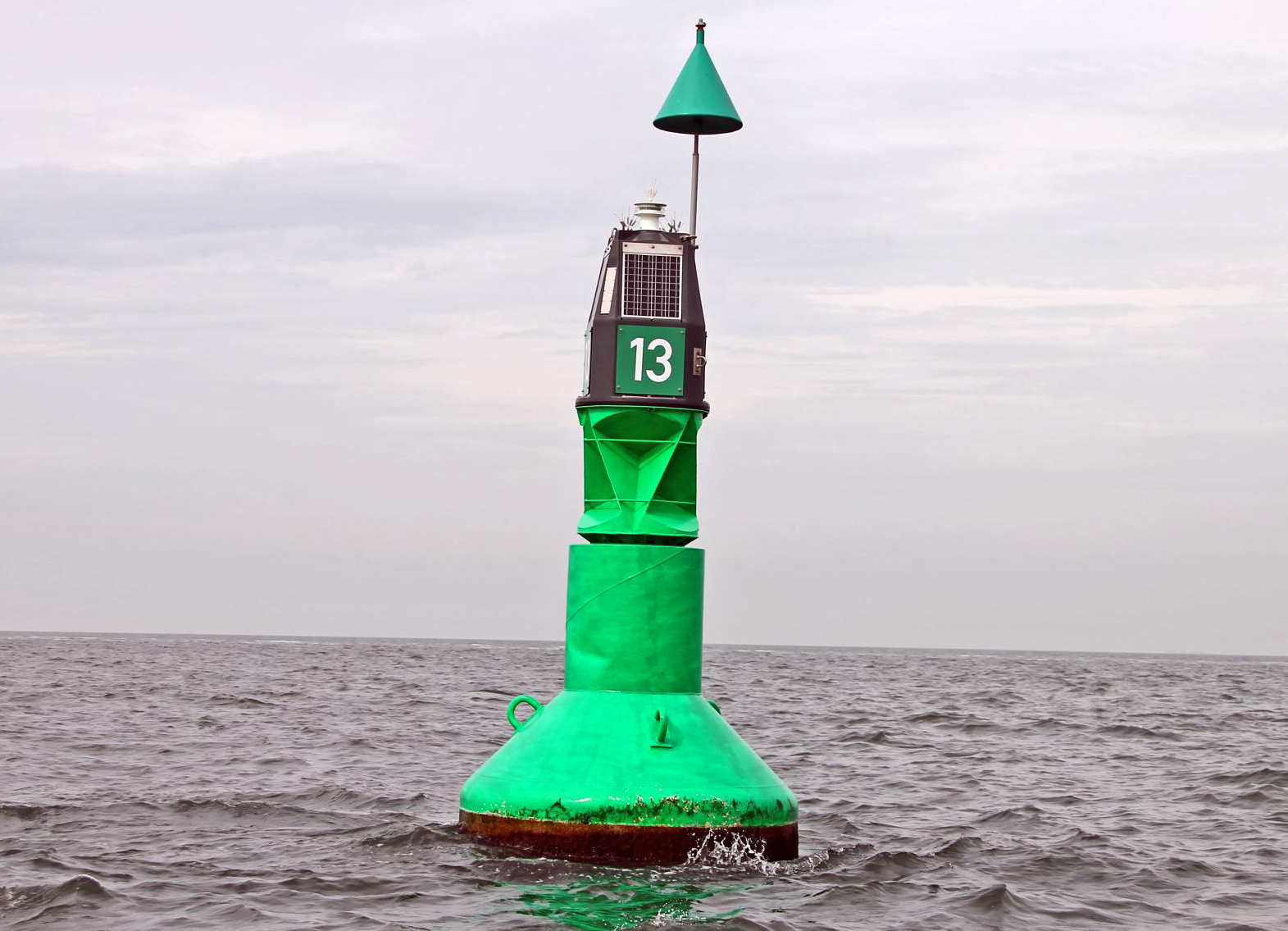 Wir sehen zu, dass wir ganz schnell auf die andere Seite kommen und fahren außerhalb des Fahrwassers an den grünen Tonnen entlang in Richtung Nordsee.