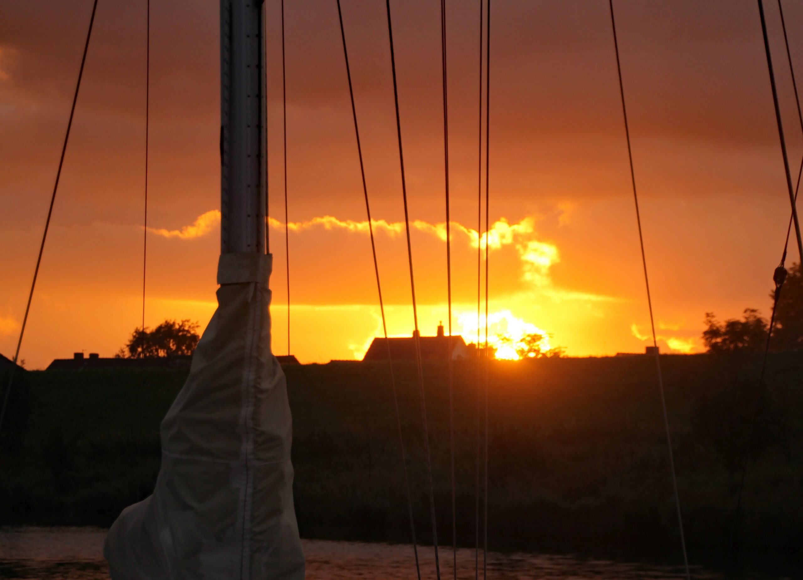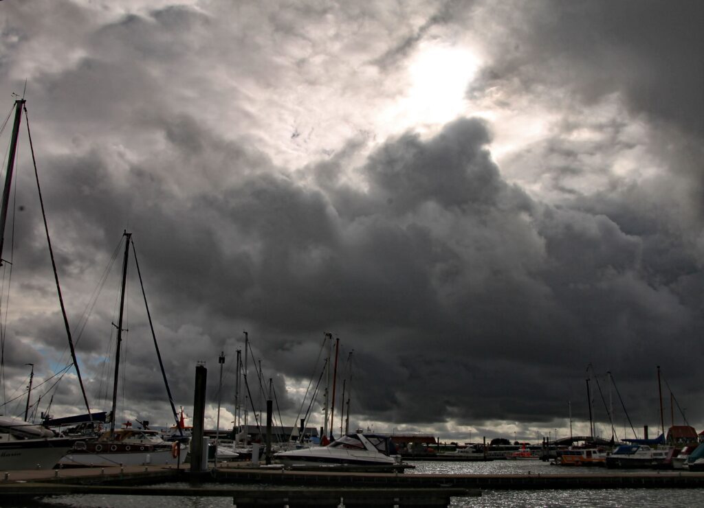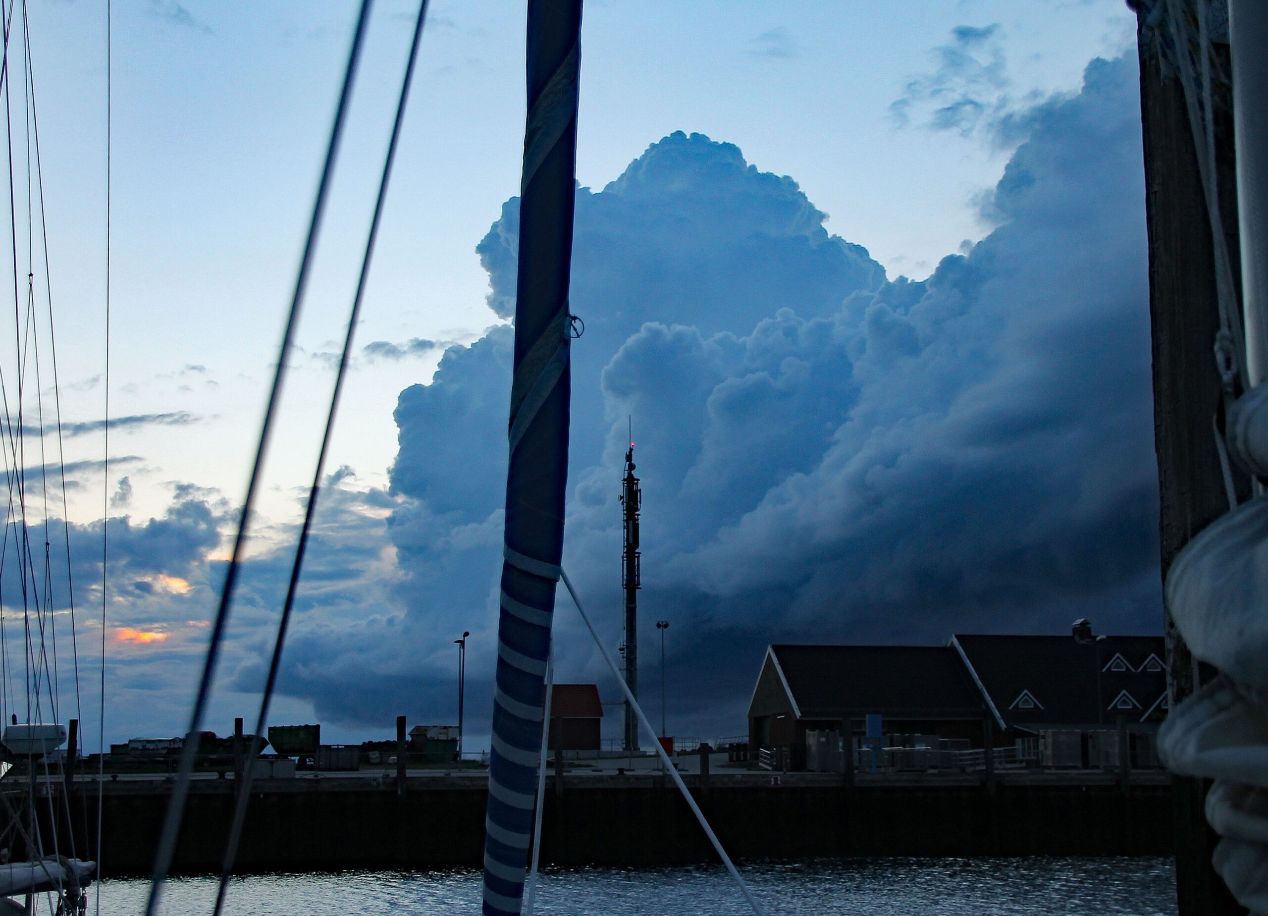 Doch gegen Abend zieht es dann heran, das große Gewitter, Starkregen, Blitz und Donner sowie Wind in Böen bis 36 Knoten. Das geht so gute 1,5 Std. Den Schlick sieht man nicht mehr, der starke Regen bringt einige cm Wasser in den Hafen.