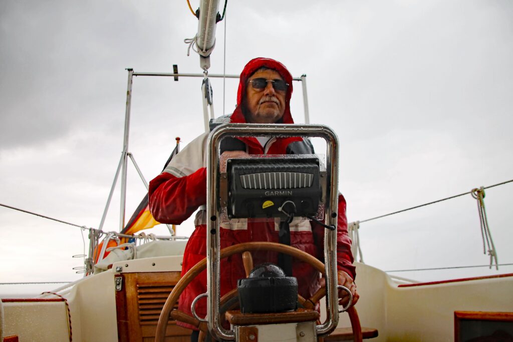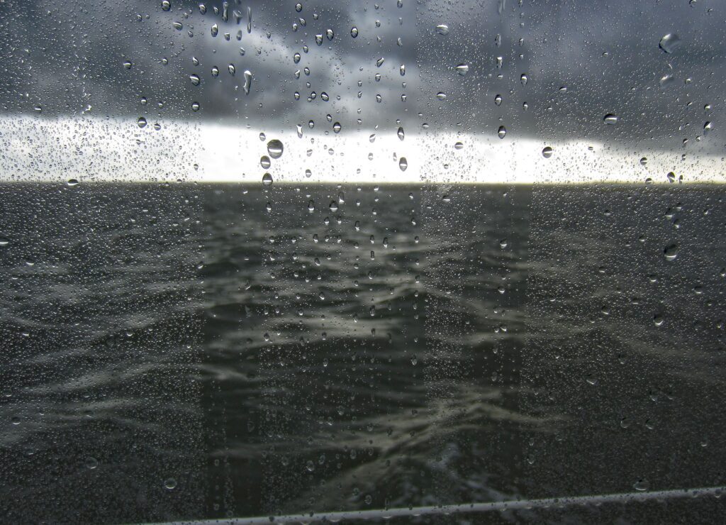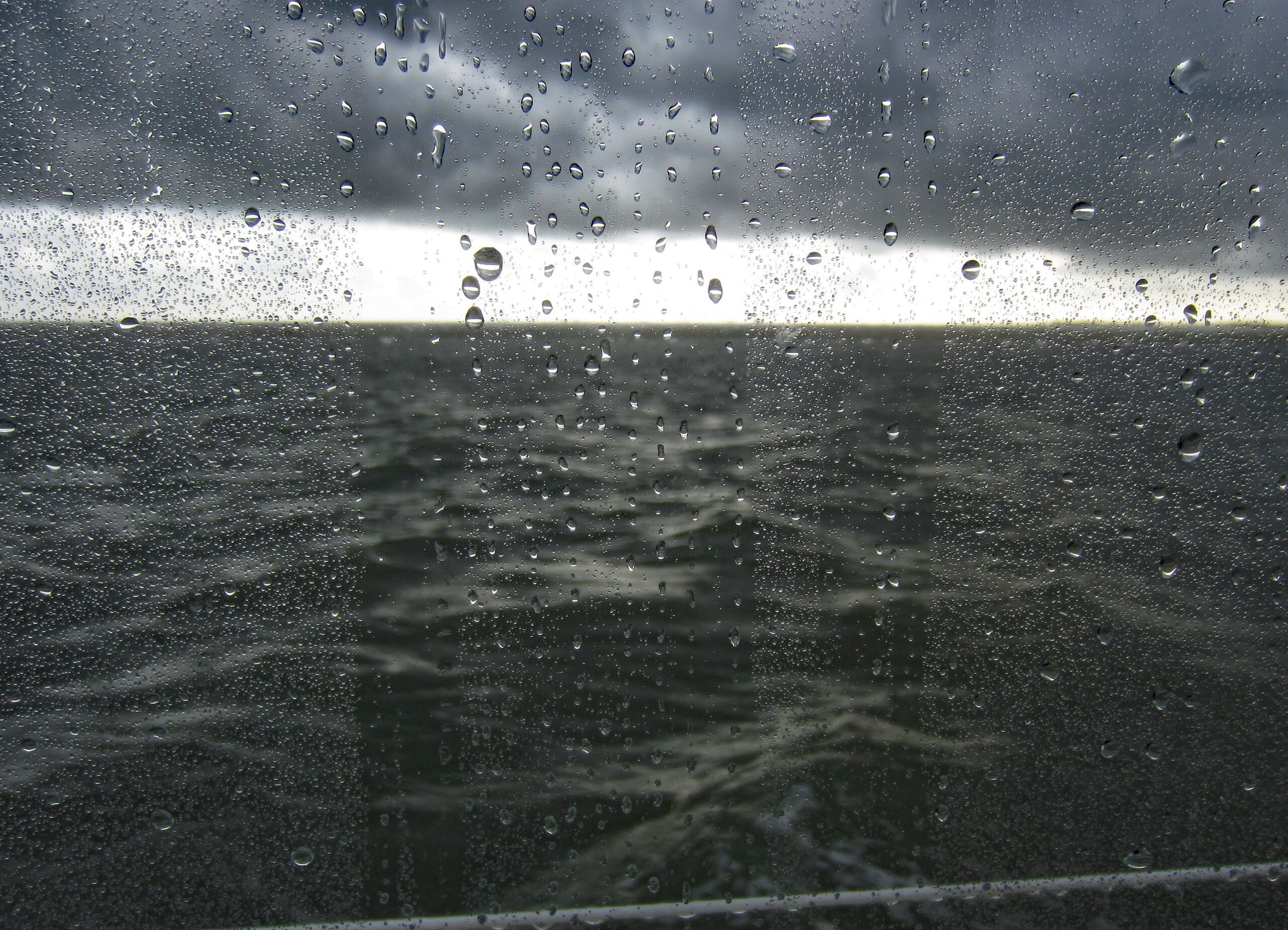 Es ist mehr Wasser in der Luft als unter dem Kiel:-)) Ein Starkregen prasselt uns aufs Dach.