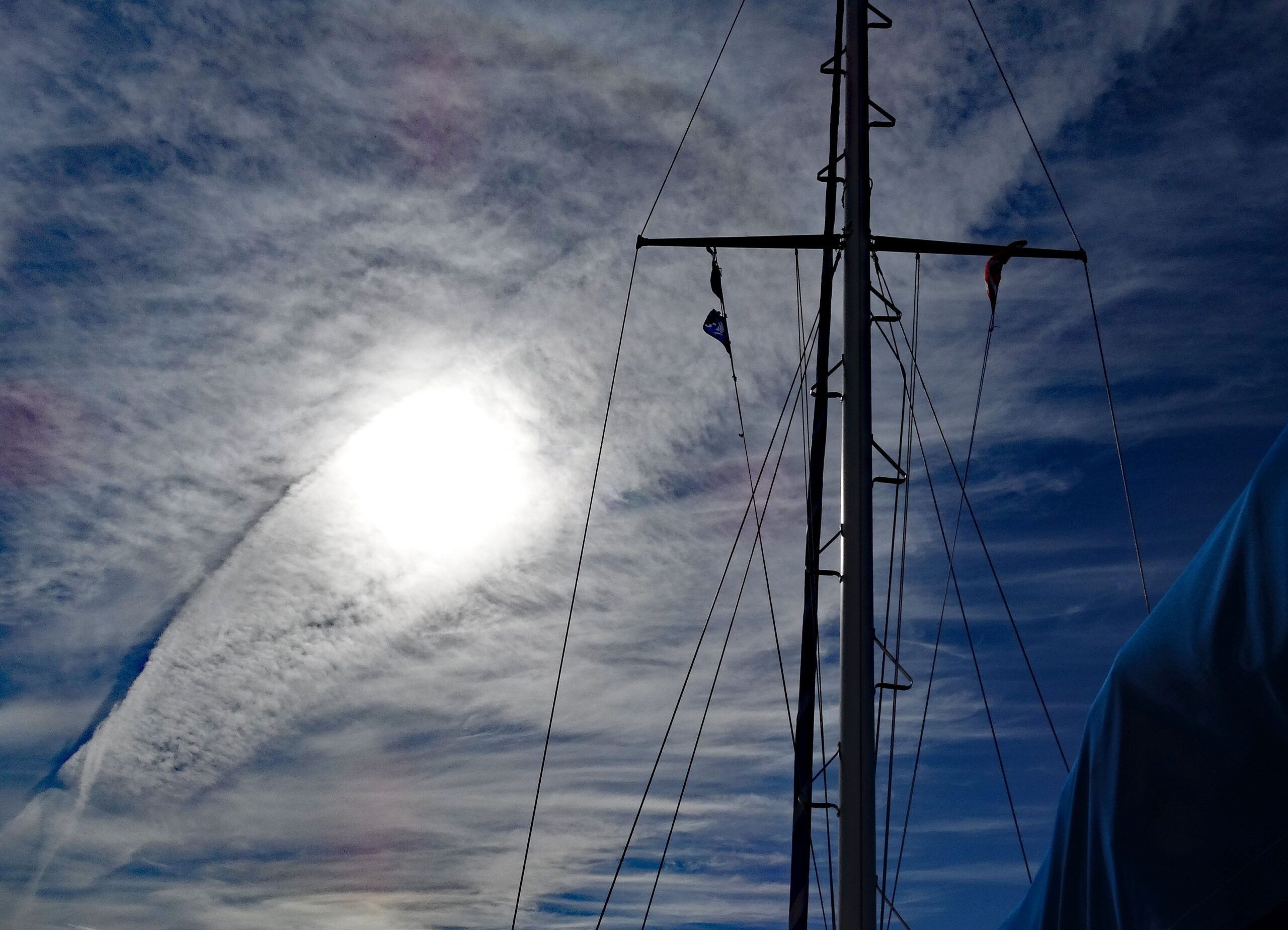 Beim Aufwachen prasselt der Regen aufs Deck, doch gegen 10:00h kommt die Sonne wieder zum Vorschein. Wir beschließen, noch einen Tag hier zu bleiben. Wolfgang widmet sich der Baumbremse und stellt fest, dass er eine stärkere Leine dafür benötigt.