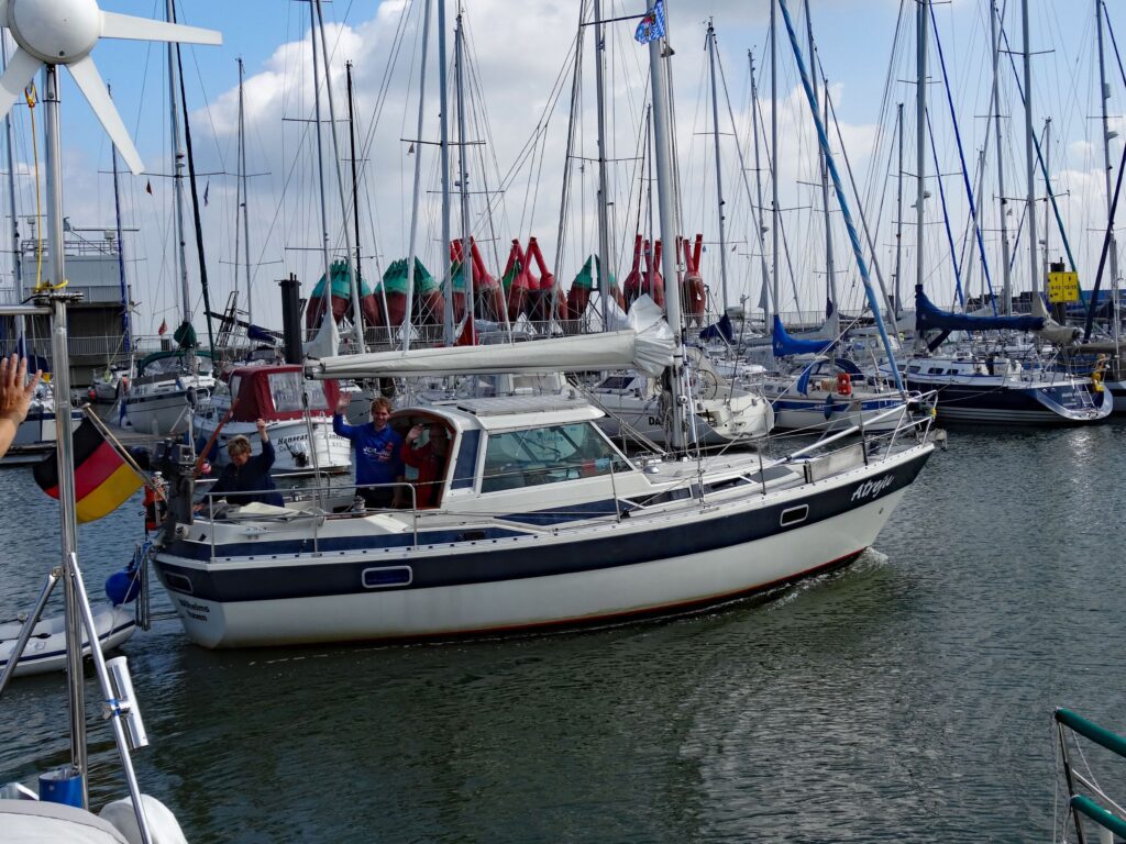 Am Abend gab es noch etwas sehr Sehenswertes: Eine Najad 570 mit dem Namen Gulliver unter amerikanischer Flagge legt in Brunsbüttel an.