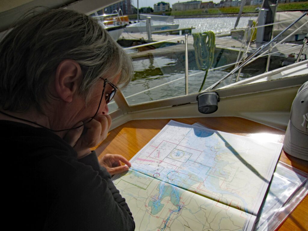 Aufstehen ist um 7:00 angesagt, da wir die erste Schleuse nehmen wollen. Da fast Niedrigwasser ist und außerdem noch Springzeit, vergewissern wir uns telefonisch, ob wir die Schleuse nehmen können.