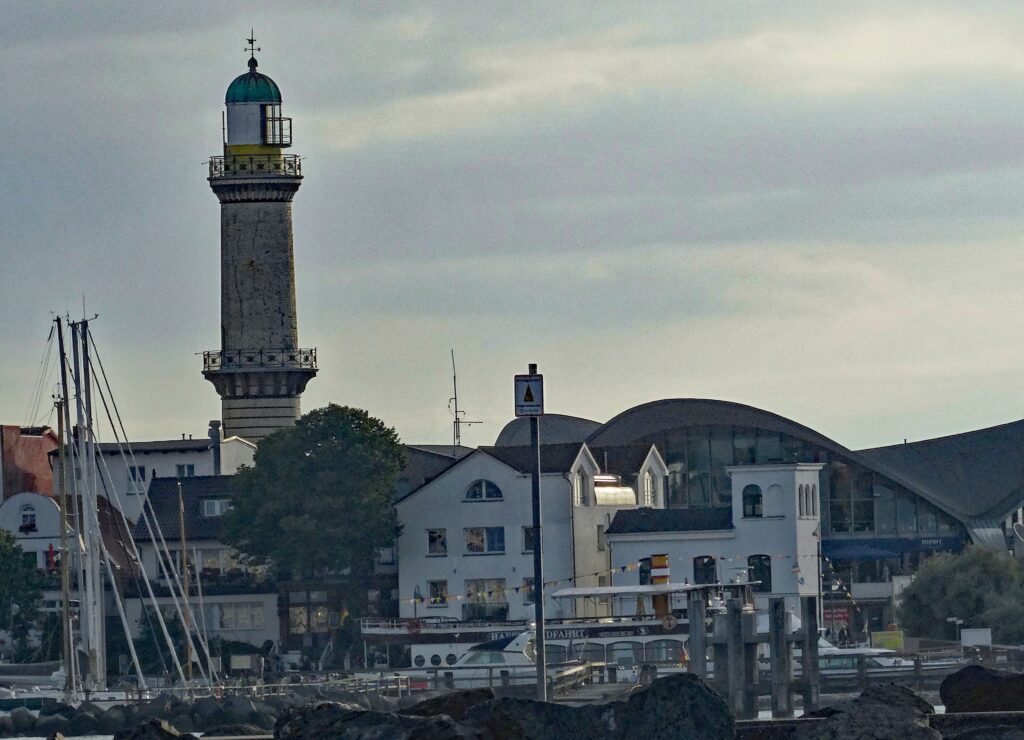 Gegen 09:00h fahren wir im Rostocker Stadthafen los. Gut 1 Std. später passieren wir die Mole von Warnemünde.