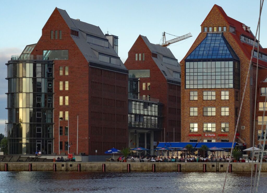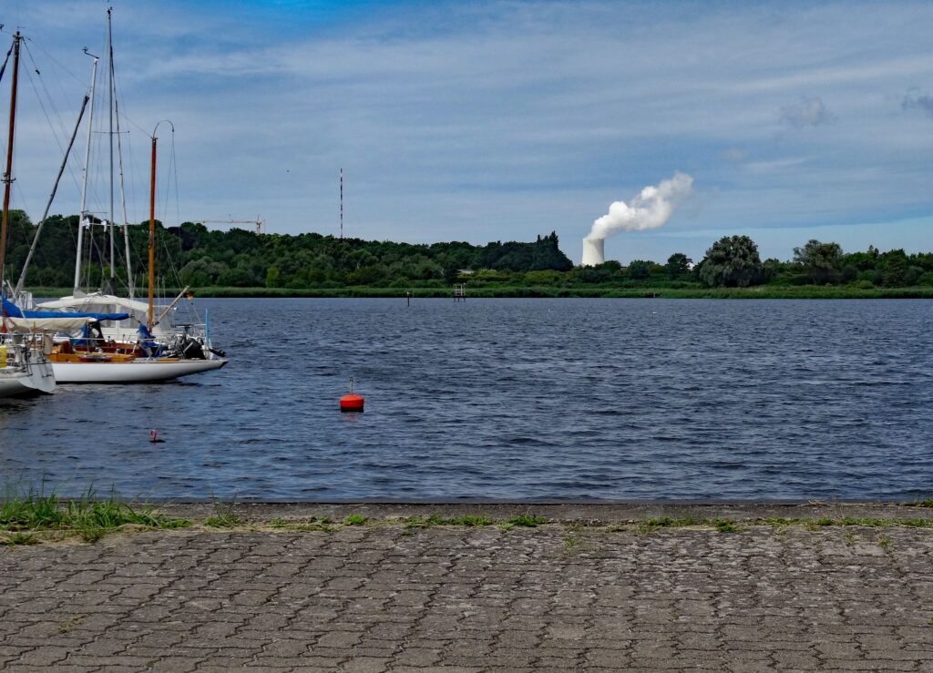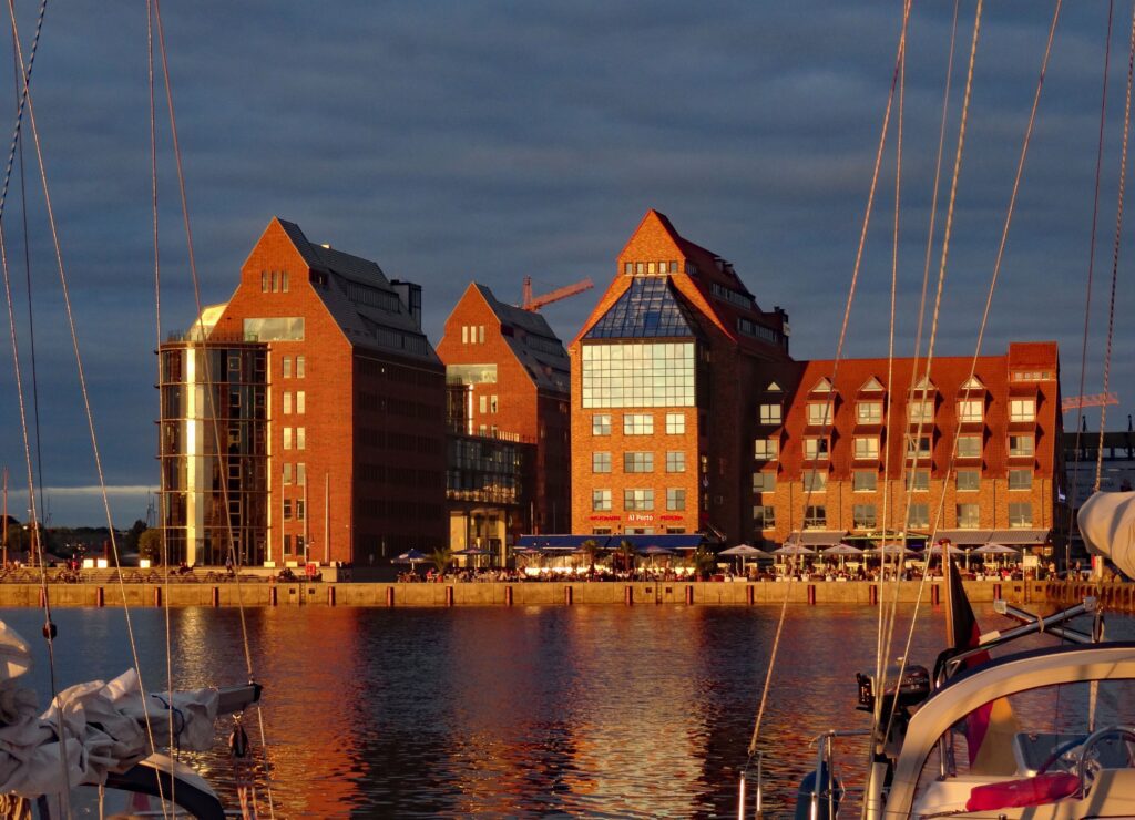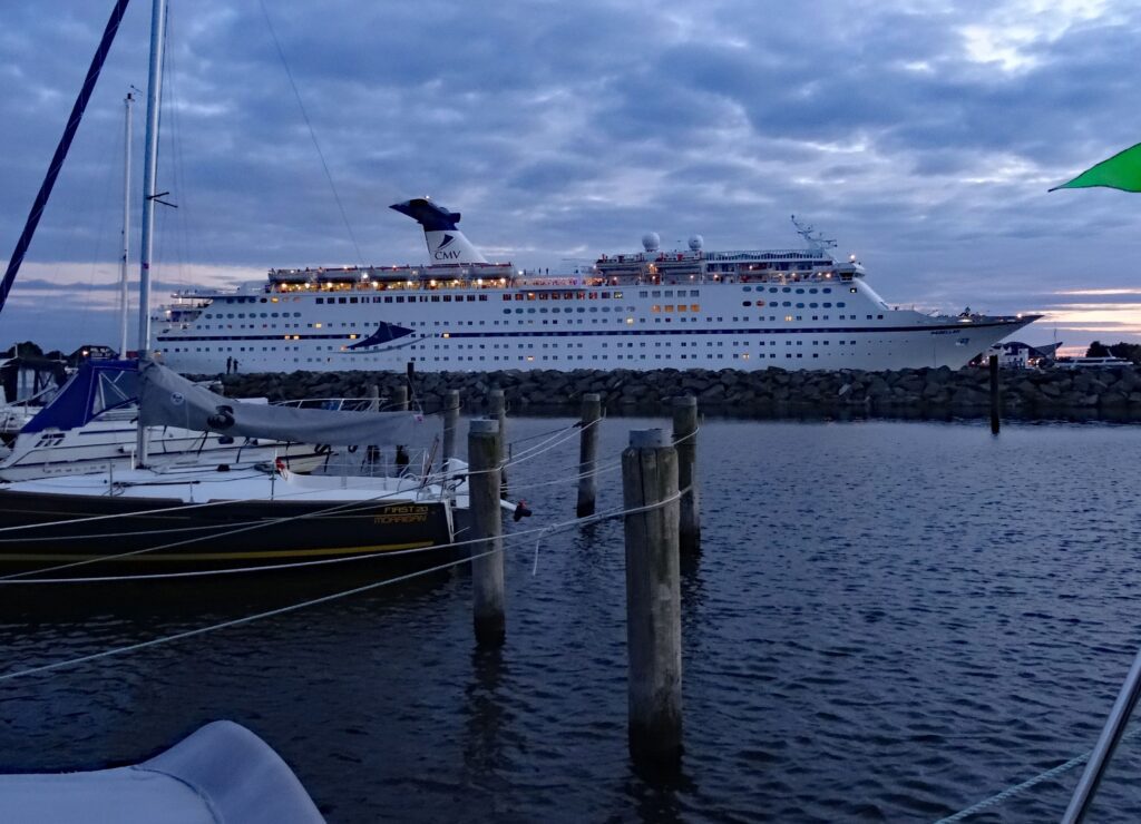 Am Abend läuft ein großes Schiff nach dem anderen am Hafen vorbei in Richtung Skandinavien. Der Wind steht für uns im Hafen recht ungünstig. Wir bekommen die Schornsteine voll mit, zumal jedes Schiff sich mit viel Getöse verabschiedet. Nein, hier gefällt es uns nicht so sehr und wir fahren morgen weiter rein nach Rostock.