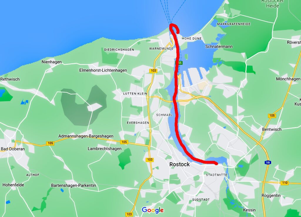 Unsere Route heute: von Warnemünde nach Rostock