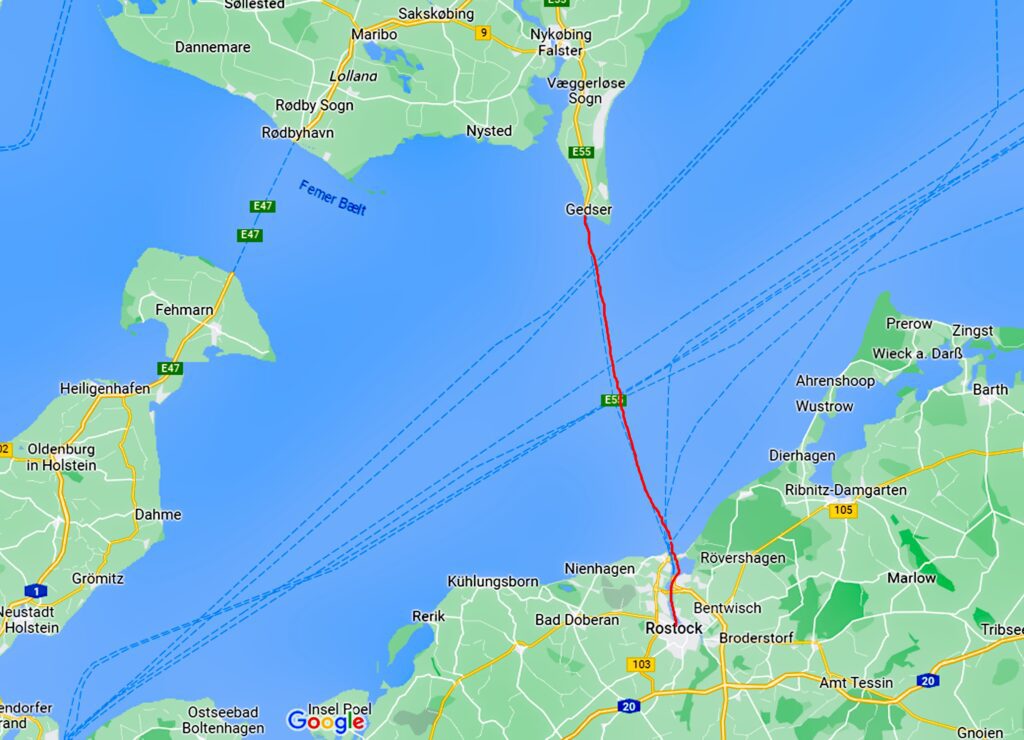 Unsere Route heute: von Rostock nach Gedser