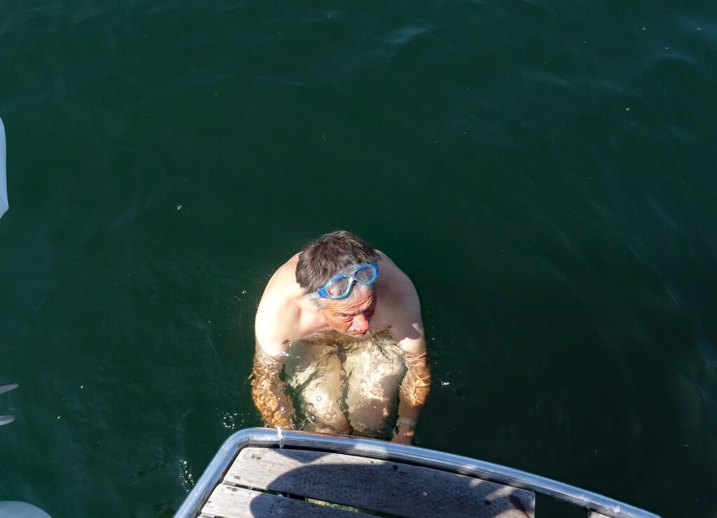 Wolfgang geht schwimmen und taucht an der Ankerkette zum Anker hinunter. Der Anker hat sich trotz des vielen Krauts gut eingegraben.