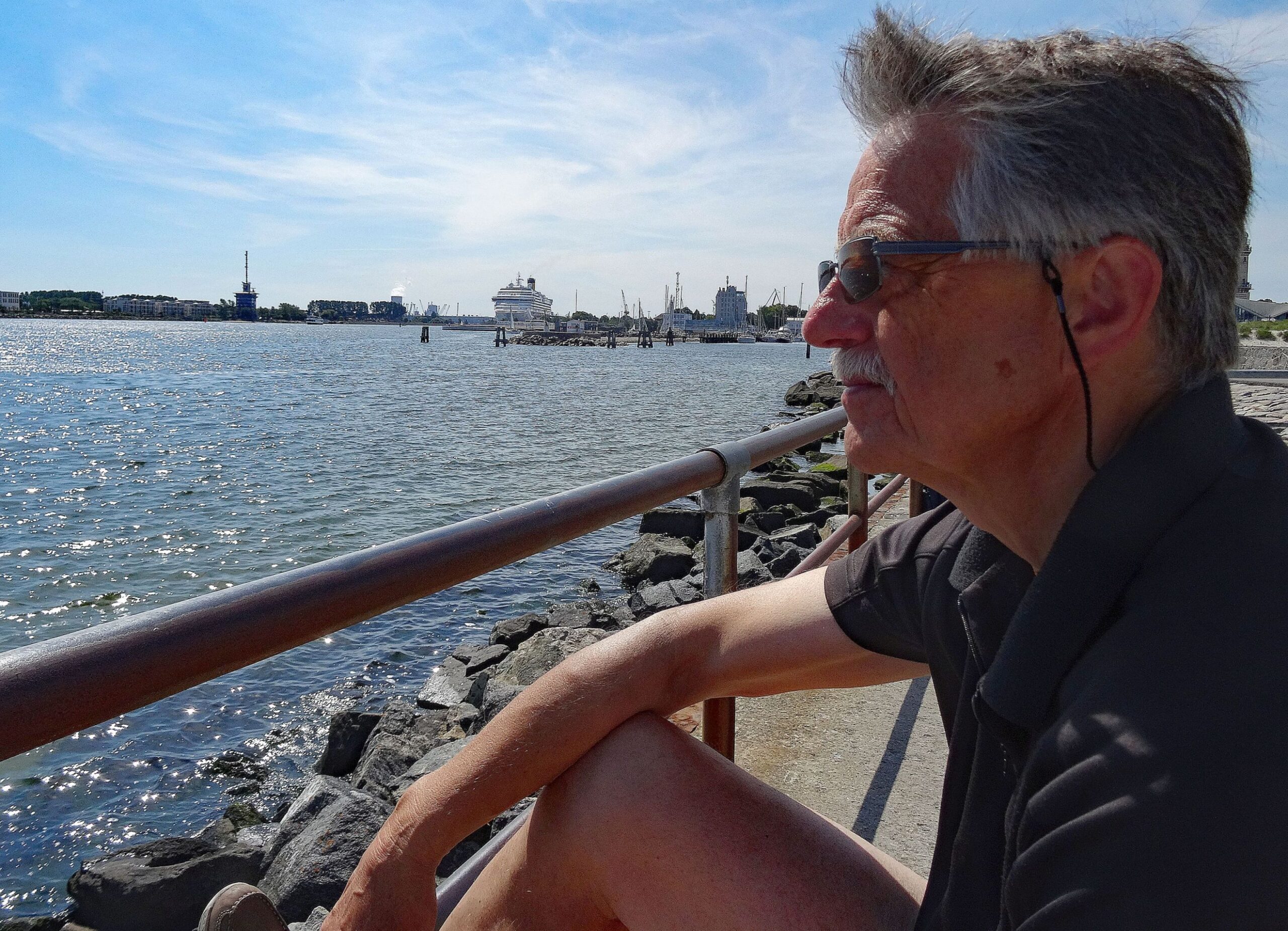 Am Abend läuft ein großes Schiff nach dem anderen am Hafen vorbei in Richtung Skandinavien. Der Wind steht für uns im Hafen recht ungünstig. Wir bekommen die Schornsteine voll mit, zumal jedes Schiff sich mit viel Getöse verabschiedet. Nein, hier gefällt es uns nicht so sehr und wir fahren morgen weiter rein nach Rostock.