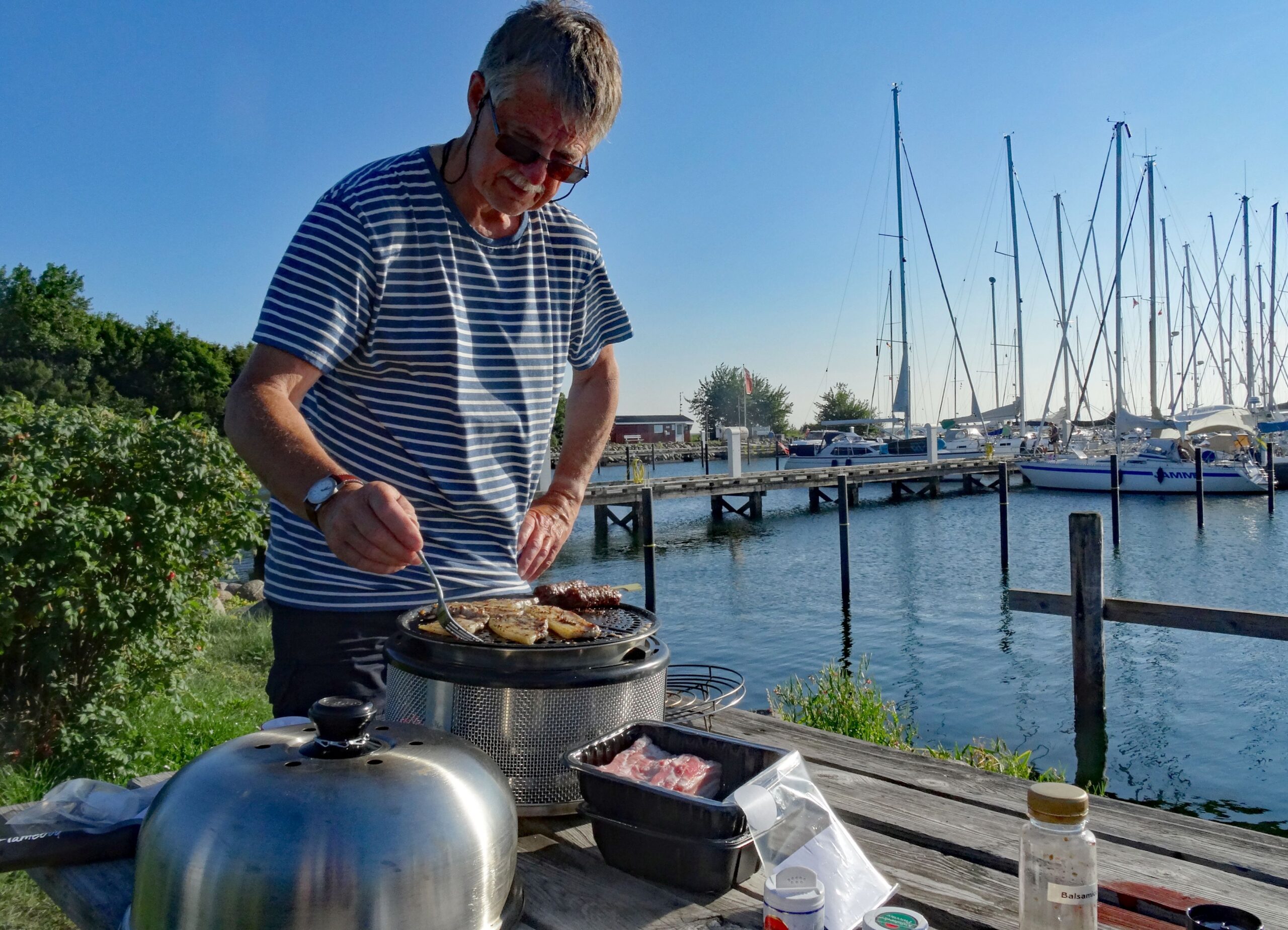 Es geht mit den Rädern zum Einkaufen, um Zutaten fürs Grillen zu holen. Hier sind im Hafen gute Möglichkeiten dafür und es ist warm, da muss man nicht im warmen Schiff noch kochen.