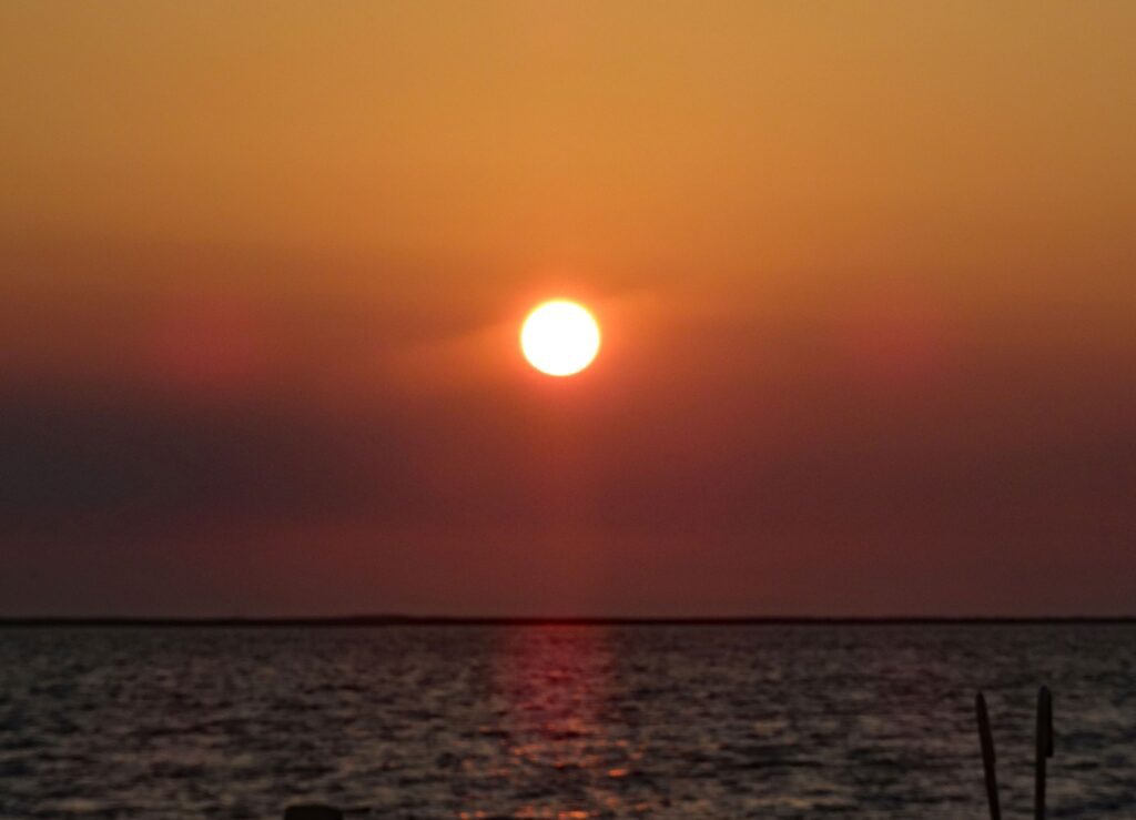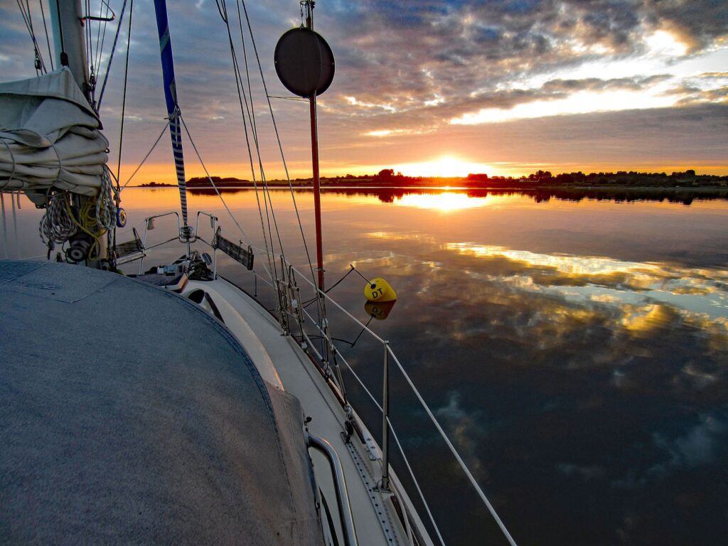 Wir stehen gegen 07:00h auf, die Sonne geht gerade vor dem Bug auf.