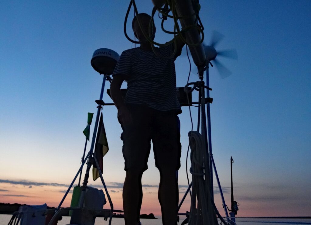 So erleben wir einen sonnigen und entspannten weiteren Tag in der Bucht von Aerø. Wolfgang geht eine Runde schwimmen, säubert ein wenig den Wasserpass. Er taucht nach der Logge, die jedoch voll beweglich ist. Dann schaut er noch nach der Zinkanode am Propeller, die schon halb weg ist. Die Dusche nach dem Schwimmen zeigt, dass der Boiler seit gestern ca. 13:00h noch warmes Wasser liefert.