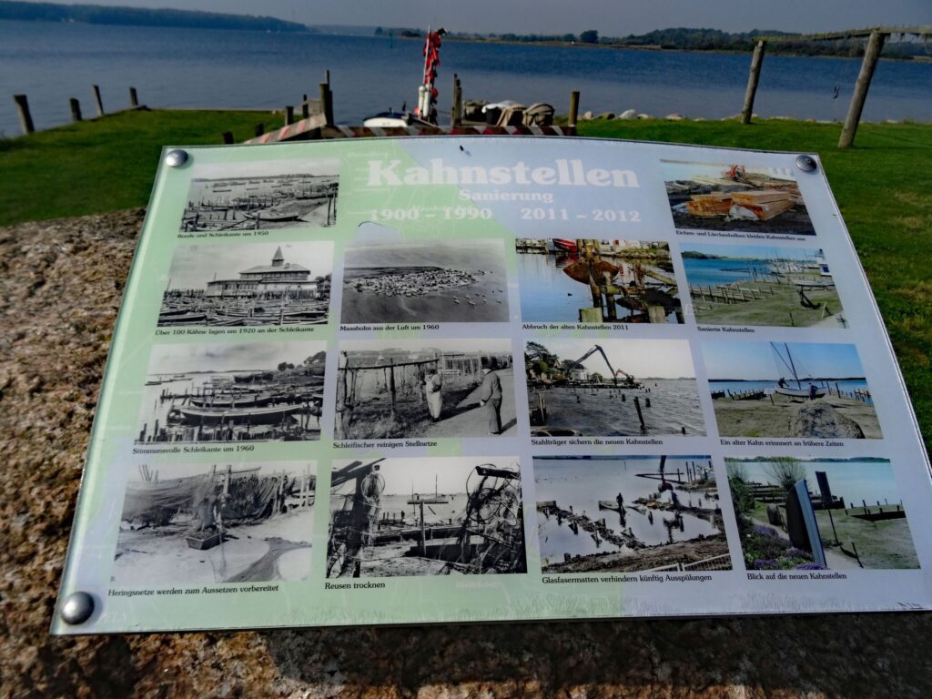 Wir kommen auch an den sogenannten Kahnstellen an der Maasholmer Reede vorbei. Diese sind einmalig und sollen wohl deshalb auch erhalten bleiben. Die 30 Kahnstellen stehen seit 1991 unter Denkmalschutz. Die EU mit dem europäischen Fischereifonds und Schleswig-Holstein haben dafür Mittel bereitgestellt.