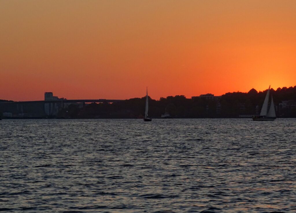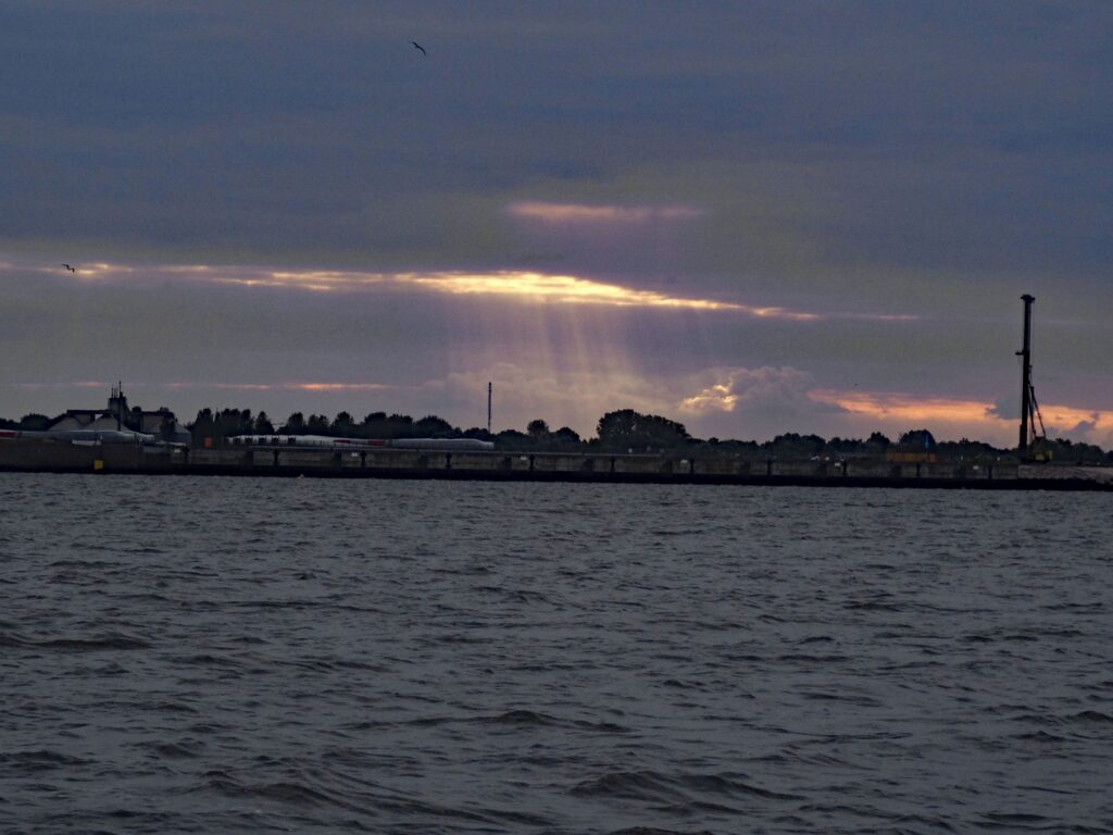 Auch im Dunkeln ist es hier gegenüber der Einfahrt zum NOK sehr interessant und gibt immer etwas zum Sehen. Wir sitzen bis fast 23:00h im offenen Cockpit. Wie oft hatten wir das in diesem Urlaub? Ich denke, das kann man an einer Hand abzählen.