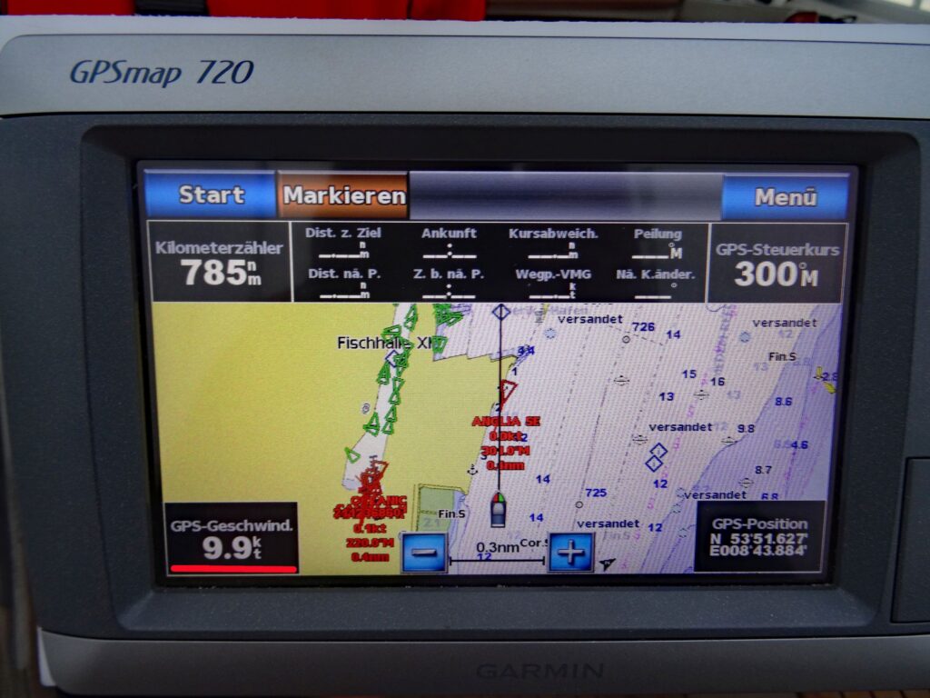 Vor der Einfahrt zum Hafen in Cuxhaven stehen schwere Kabbelwellen. Bei der starken Strömung müssen wir fast quer zur Einfahrt in den Hafen fahren.