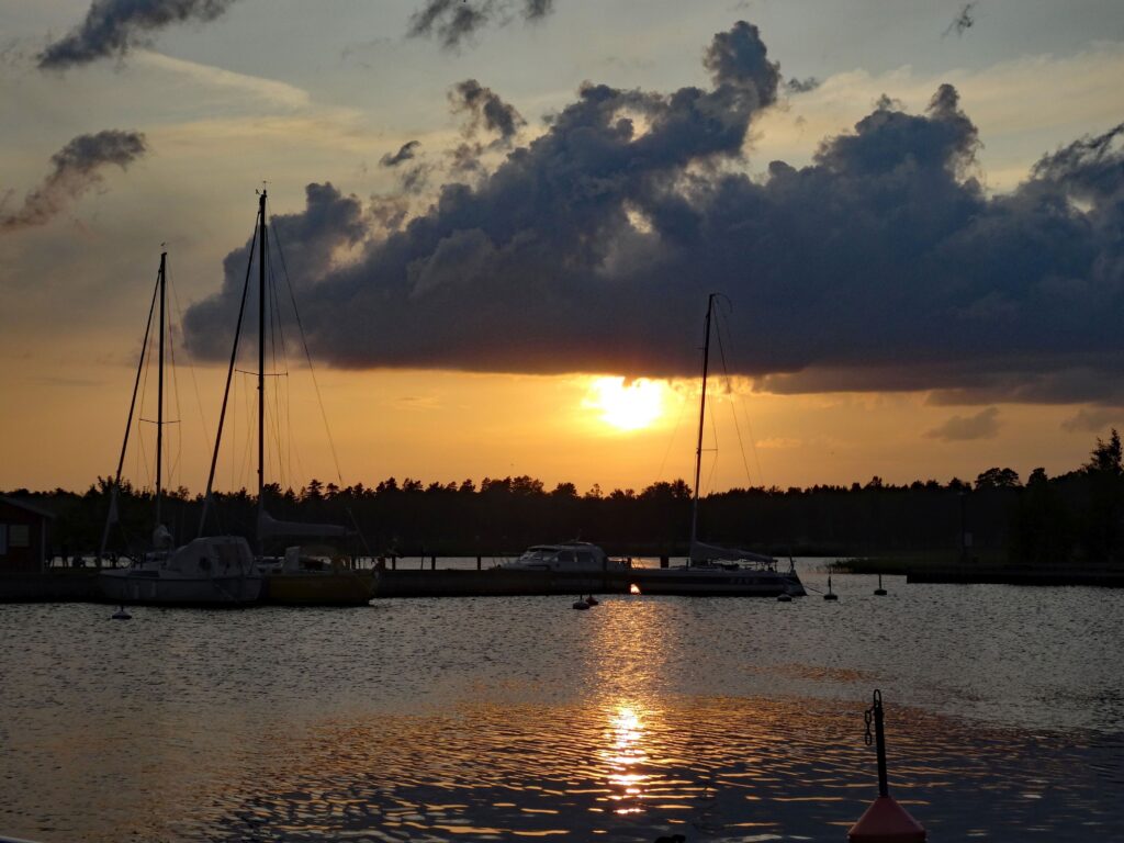 Vormittags fahre ich mit Joachim zur Apotheke, er braucht ein Medikament für seinen beginnenden Heuschnupfen. Er wird aber von der Apotheke erst mal zum Arzt geschickt. Ich fahre in der Zeit zum ICA zum Einkaufen. Als er zurück ist, fahren wir gemeinsam zu einem Angelladen und kaufen eine Angel und Zubehör für ihn und neue Blinker für mich, die er bei unserem letzten Angelversuch versenkt hatte. Für den weiteren Tag ist nur noch Ruhe angesagt, unterbrochen von 2 x baden im Hafen. Abends macht Konstanze einen äußerst leckeren Salat mit Baguette. Heute ist das so viel, dass ich bald platze. Heute Nacht soll dann ein Regentag anfangen. Mal sehen, wie das wird. Wir werden deswegen auch morgen noch in Karlsborg bleiben.
