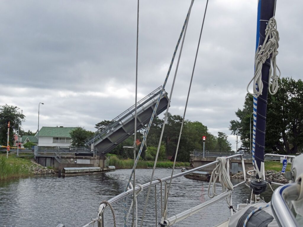 O-Ton Wolfgang: 08:45h Maschine an, nur mit einem speziellen Leinenmanöver kommen wir heute von unserem Liegeplatz weg. Genau hinter uns hatte sich am späten Abend noch ein großes Motorboot gelegt. Der Wind hat sich gedreht und drückte uns auf den Kai und der Radeffekt ging in die falsche Richtung. Manöver klappt aber gut und wir stehen kurz vor unserer ersten Brücke mit Schleuse. Nr. 22