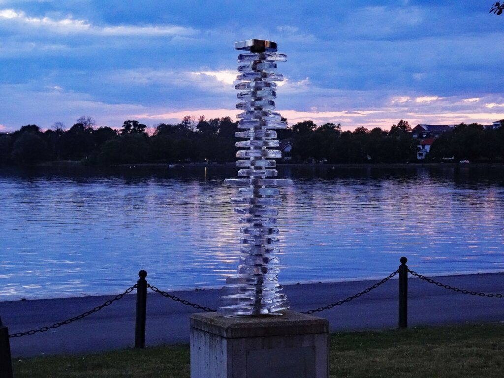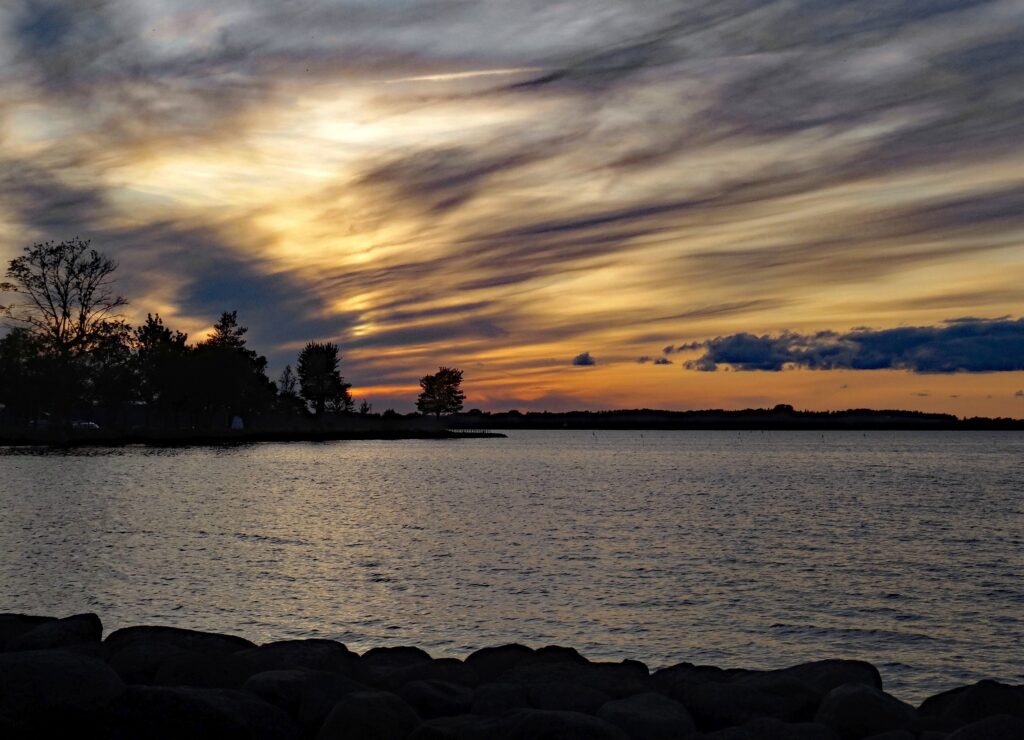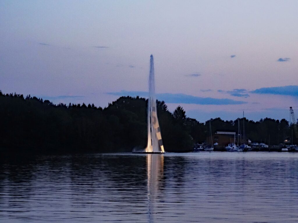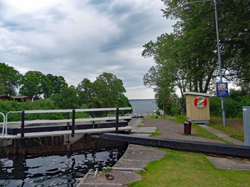 Da wir heute hierbleiben wollen, machen wir sofort die Räder klar und fahren zu den ca. 2 KM entfernten Lidl. Neuer Laden, sehr gut aufgeräumt. Schwer bepackt kommen wir wieder aufs Schiff. Die Fahrt war nett, entlang am Wasser durch schöne Außenbezirke. Zum Kaffee gehen wir in den Eisladen, der nur ca. 10 m vom Liegeplatz entfernt ist. Beim letzten Bissen Eis, ca. 17:00h, setzt ein Regenschauer ein. Vorher war Wolfgang aber schon im „Systembolaget“ und hat seinen Linienvorrat aufgefüllt. 4 Flaschen sind in den Stauraum gewandert. Abends bereite ich Frikadellen und einen Kartoffelsalat. Danach machen wir einen kleinen Spaziergang zur Schleuse und gegen 23:00h sind wir zurück. Heute wird es gar nicht richtig dunkel.