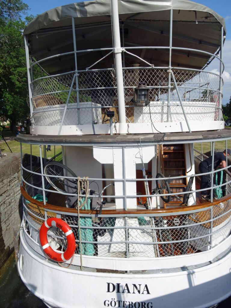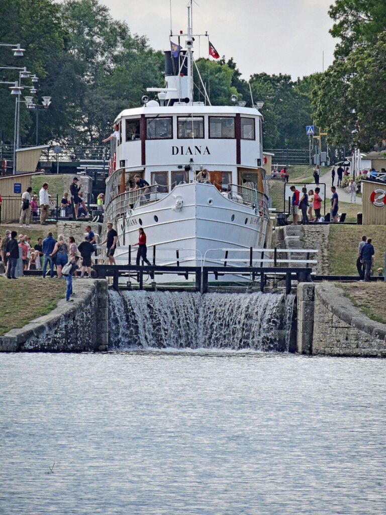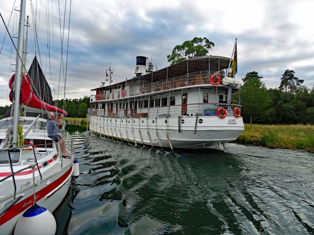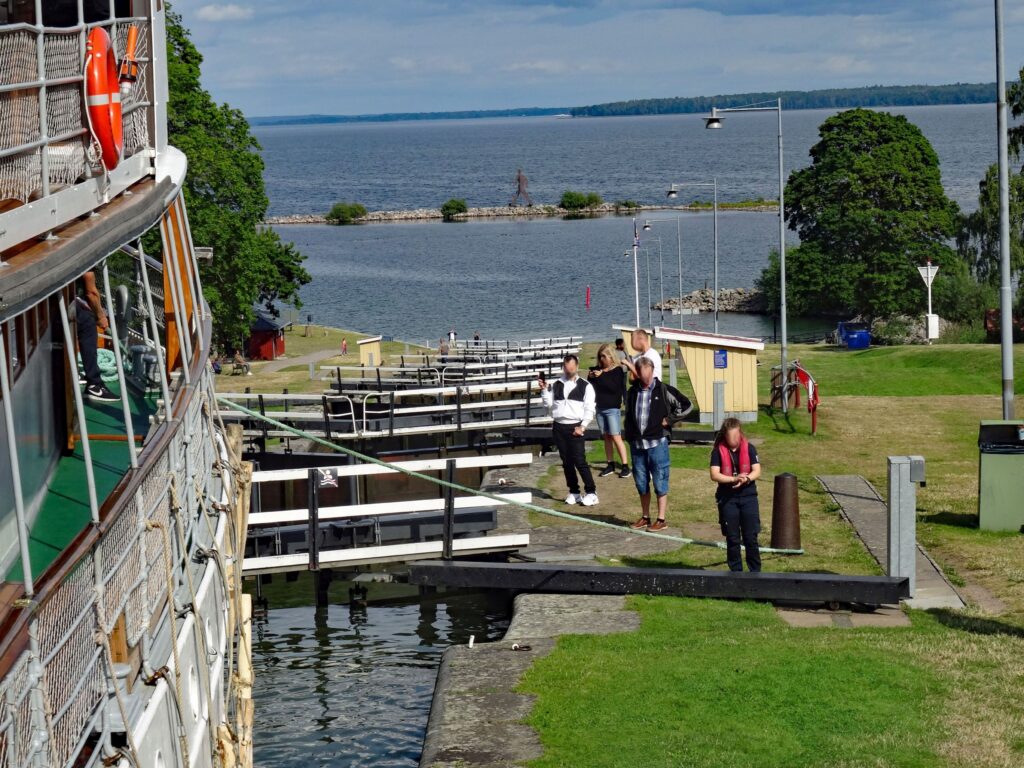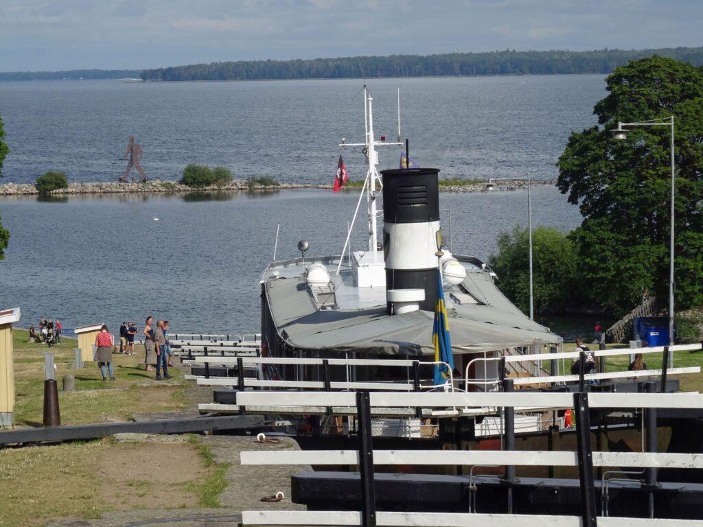 Nachmittags gehen wir gemeinsam mit Margot und Joachim ein Eis am Hafen essen. Ich mache noch einen Gang zum ICA und Konstanze bekommt tolle Fotoaufnahmen von der „Juno“ in den Kasten, die hier gegen 19:30h durch die Schleuse kommt.