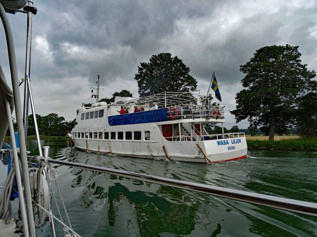 10:55h Motor aus. Fest an einem Anleger (ehemals Motormuseum). Wir warten dort, da Konstanze auf ihrer App feststellt, dass uns das Passagierschiff WASA LEJON entgegenkommt. Ich nutze die Zeit und wechsele die gerade jetzt zum Kaffeekochen leere Gasflasche.
