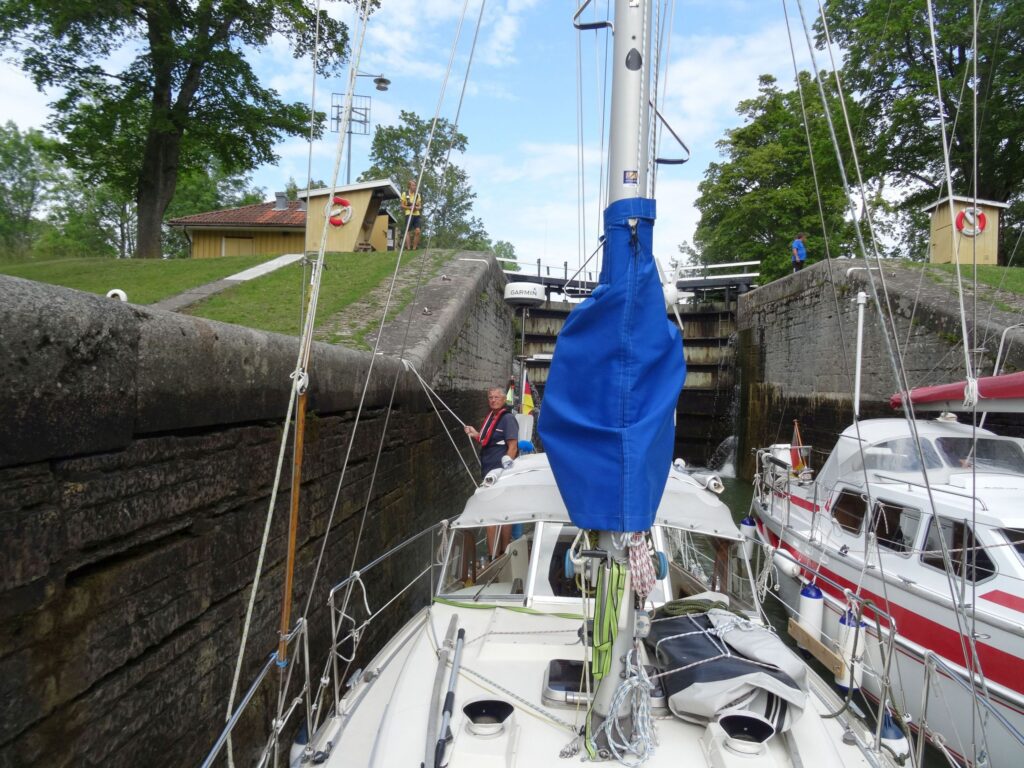 14:35h Motor aus, Leinen fest, längsseits im Gästehafen von Berg, genau vor der 7-fach Schleusentreppe.