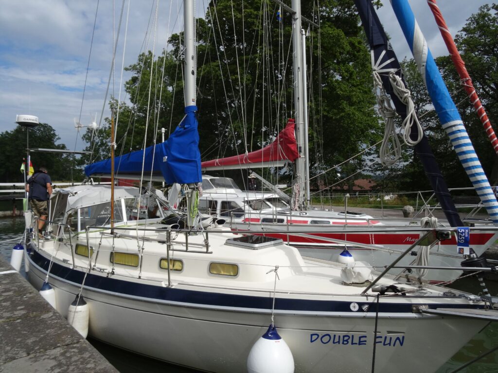 12:00h fest im Gästehafen Borensberg, Motor aus. Schöner Längsseitensteg, sehr gute sanitäre Einrichtungen. Duscheinzelkabine, groß