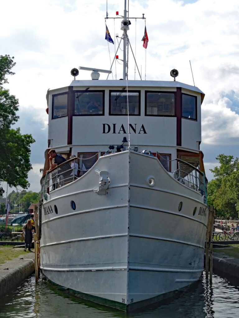 und nicht viel später kommt die DIANA von oben herunter und entschwindet in die große Schleusentreppe. Die DIANA ist das jüngste Schiff der Flotte, sie wurde 1931 vom Stapel gelassen.