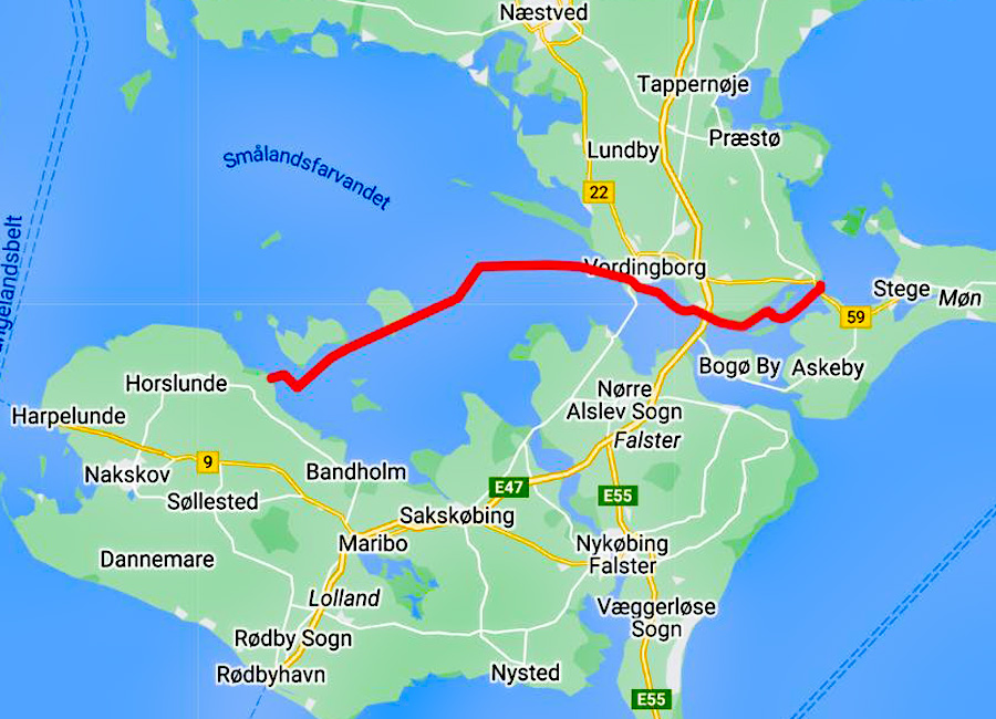 Fahrt im Ulvsund vorbei an Langø und Tærø. Durch die Farøbroerne und in den Kalvestrøm, durch die Storstrømbroen in den Storstrømmen, herum um die Flachs oberhalb von Falster zur Nordtonne östlich Femø, zur Südtonne südlich Femø, zur Nordtonne östlich Fejø, von dort zur Südtonne südlich Fejø und von dort zum Hafen von Kraegenæs.