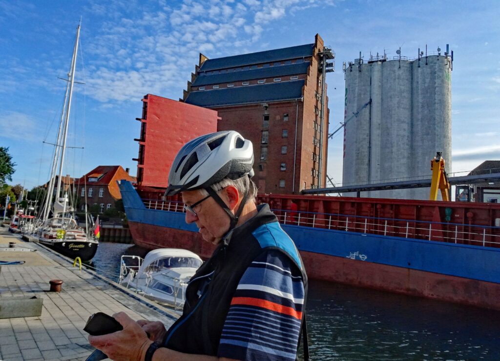 Ich war mit dem Lenker an den Absperrungen (damit keine Autos auf dem Weg fahren können) hängen geblieben und schon lag ich auf dem Radweg. Hilfreiche Radler halfen mir wieder auf. Wir fahren dann nach einer kurzen Pause zurück zum Hafen.