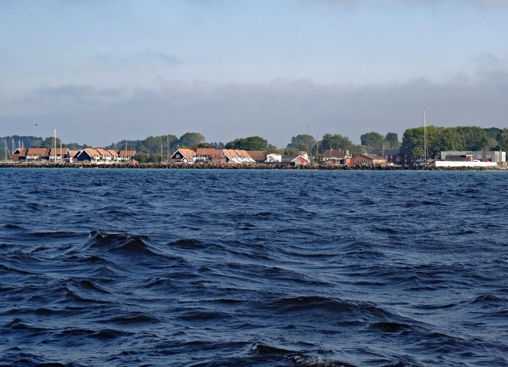 Nach einer guten Dusche frühstücken wir noch in Ruhe auf dem Boot und dann geht es los in Richtung Klintholm. Nach ca. 1,5 Std. setzen wir die Fock. Inzwischen hat sich der Wind verstärkt und die Wellen sind ca. 1m. Wir können mit der Fock den Kurs nicht halten. Also muss die Fock nach gut 30 Minuten wieder gestrichen werden.
