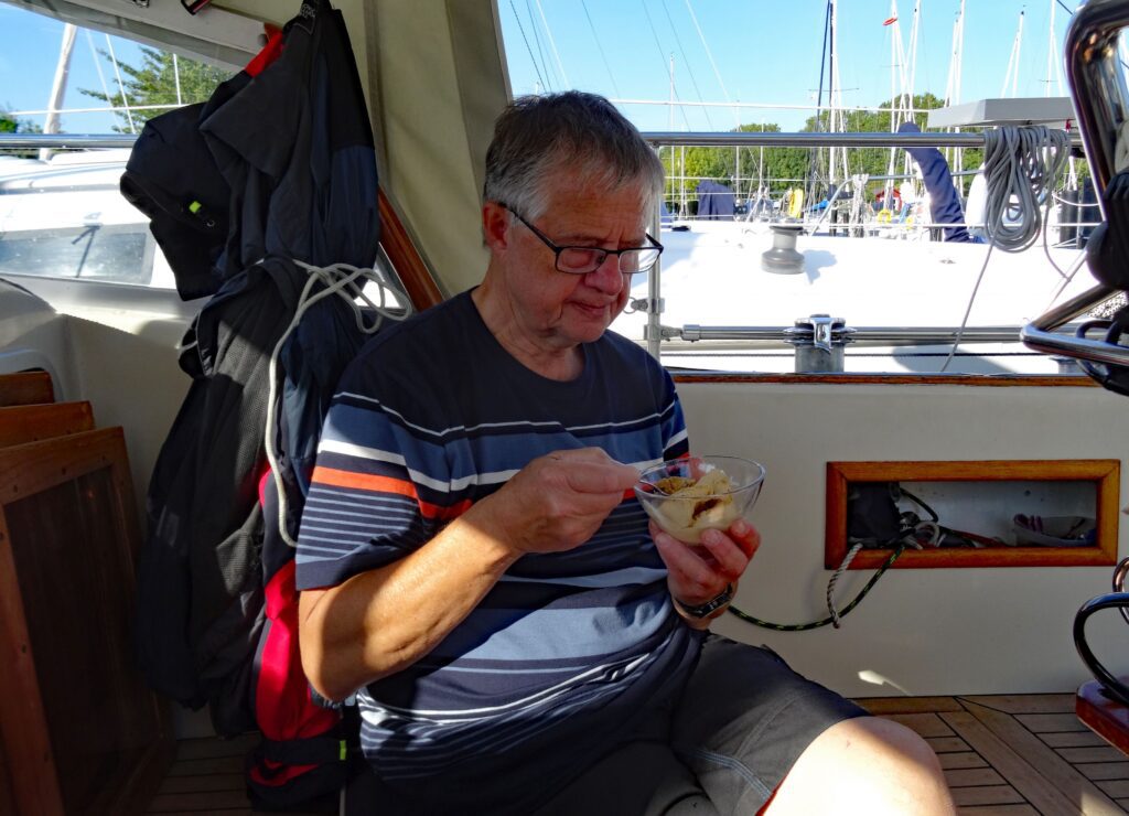 Lidl ist in unmittelbarer Nähe des Hafens und wir holen uns ein Eis, da die Sonne heute nochmal sehr warm scheint. Das Eis ist so süß, dass es uns fast anekelt.