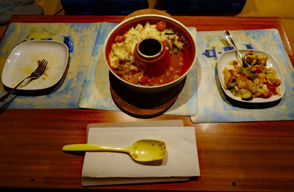 Ich backe zwischenzeitlich einen Kuchen im Omnia und später noch Frikadellen. Die können wir leider am Abend noch nicht essen, da ich versehentlich statt der Pfirsichdose für den Kuchen die Dose mit der Linsensuppe geöffnet habe. Diese schmeckt uns aber zum Abendessen auch sehr gut.