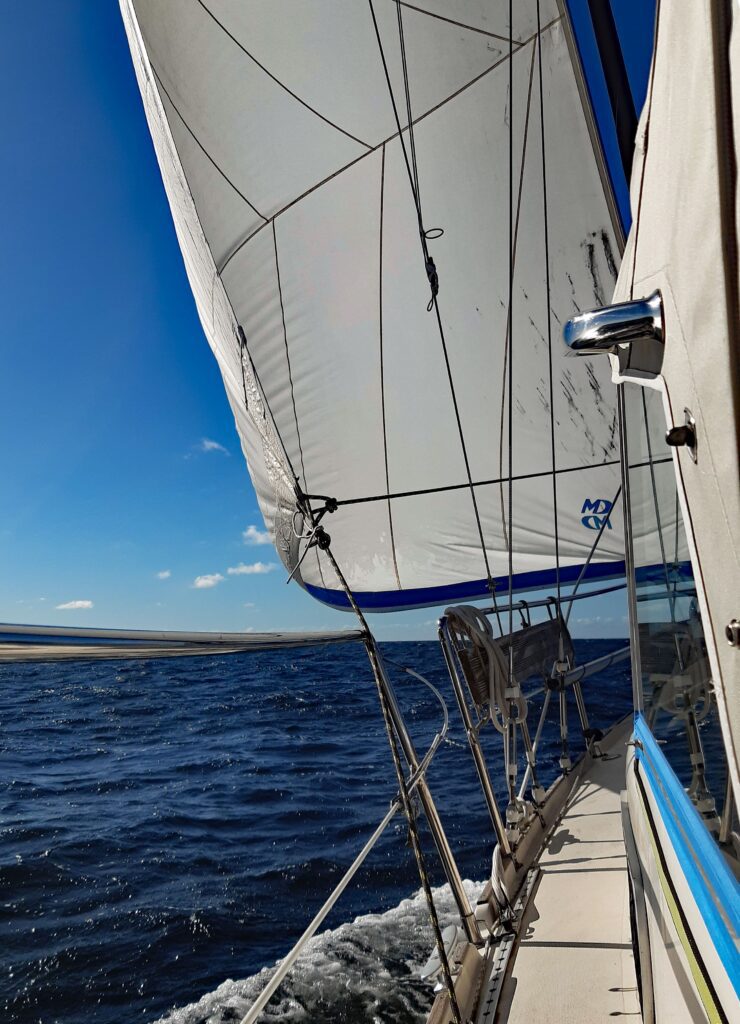 Knapp eine Stunde später segeln wir in Richtung Süden. Bei westlichen Winden laufen wir bis zu 7 Kn. nur unter der Genua.