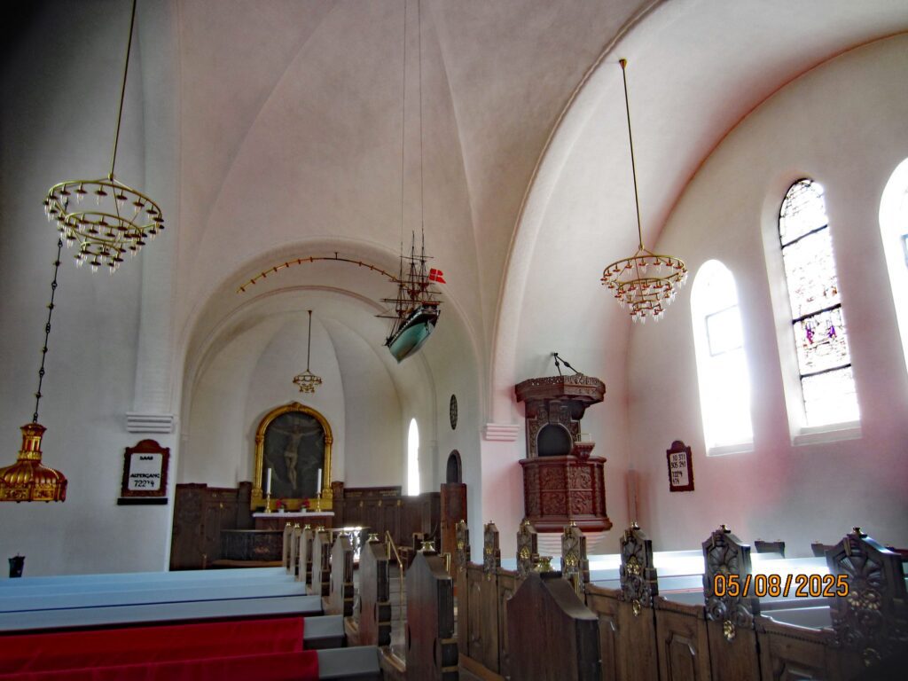 Die „Kirke“ von Juelsminde. Hell, freundlich, wie wir es von Besuchen her kennen, die Kirchen in Dänemark ähneln sich doch sehr: sauber und gepflegt.