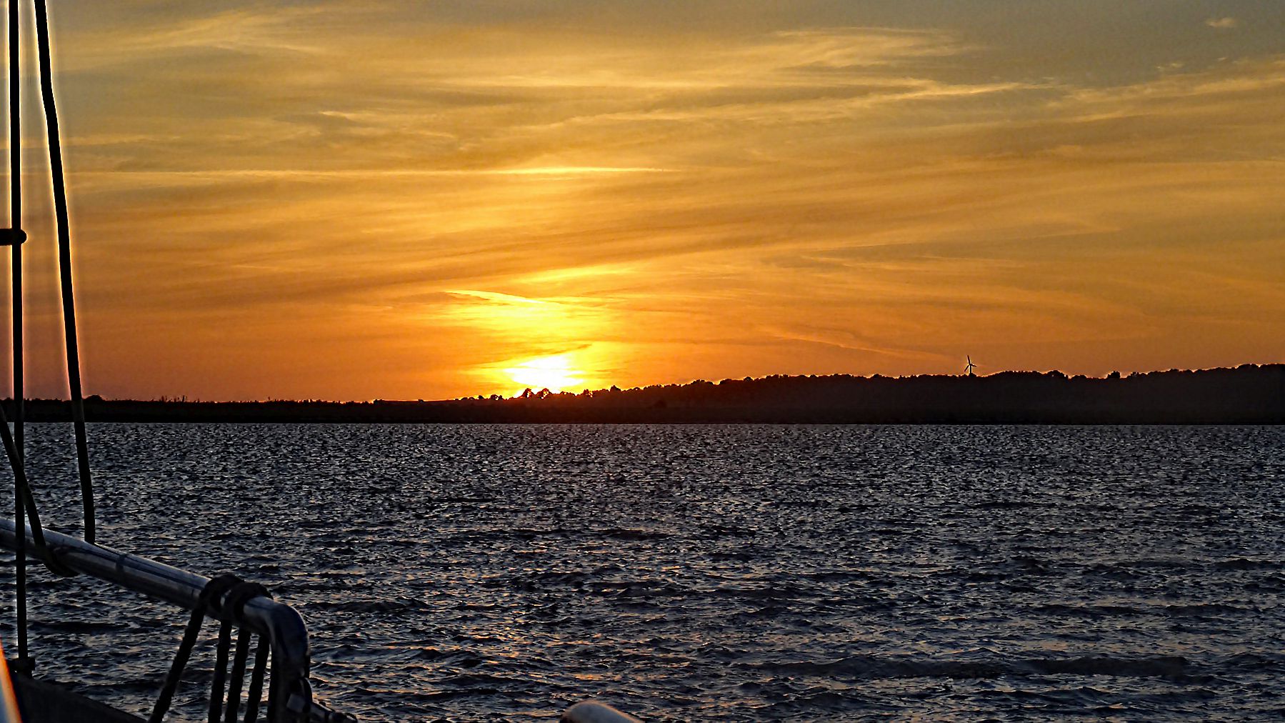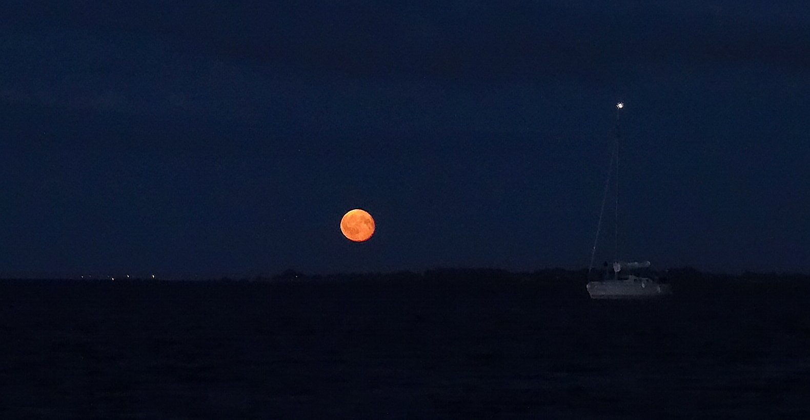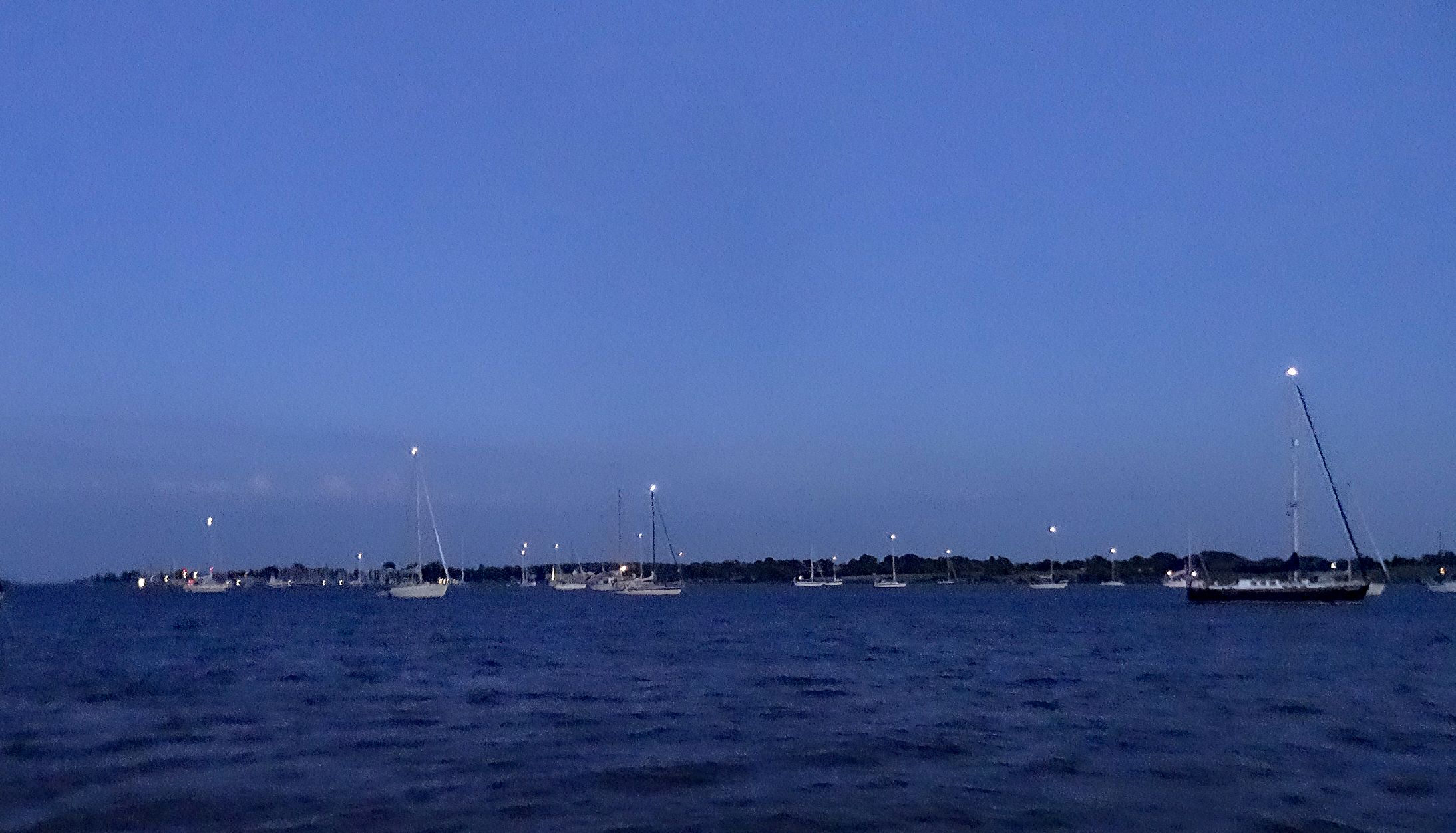 Kurz vor Mitternacht stellt mein lieber Mann fest, dass wir zu sehr auf das hinter uns liegende Boot getrieben sind. Ich, schon im Halbschlaf, raus aus der Koje, um mitzuhelfen. Dann leider hat sich der Vollmond just zu dieser Zeit hinter Wolken versteckt.