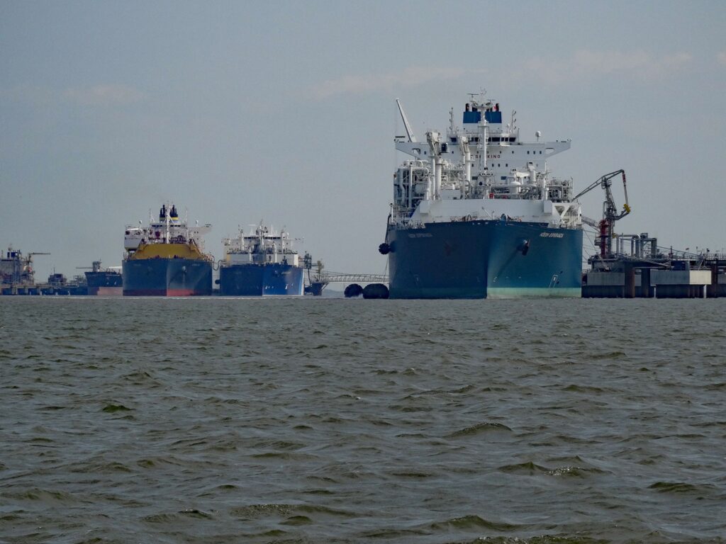 Nun ist das 2. Schiff, die „Excelsior“ da. Im April hat sie an dem eigens für sie gebauten Inselanleger 1,5 Km vom Ufer entfernt, festgemacht. So wie es ausschaut, bekommt sie gerade eine Ladung Flüssiggas.