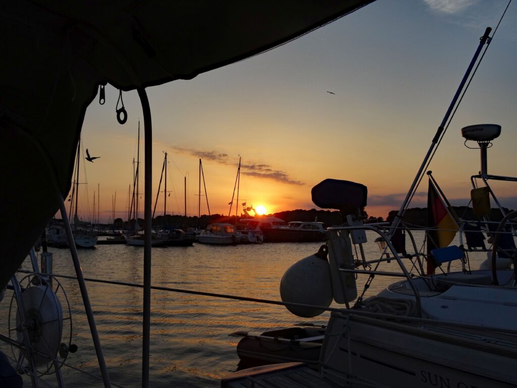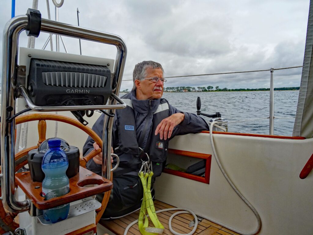 Der Anker fällt gegen 10:30 bei der Position 54° 35,254 N – 11°54,984 E auf krautigem Untergrund, aber er hält sofort. Dann wird auch noch der Heckanker getestet, auch er scheint gut zu halten.