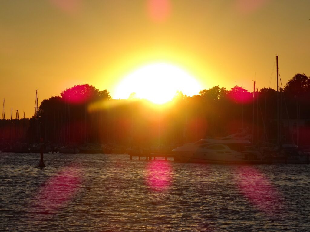 Am Nachmittag gibt es nur einen kurzen Sprühregen für heute und ansonsten nur Sonne. Wir können nach leckeren Bandnudeln mit Lachs bis gegen 22:00h draußen sitzen und dem Sonnenuntergang zusehen.