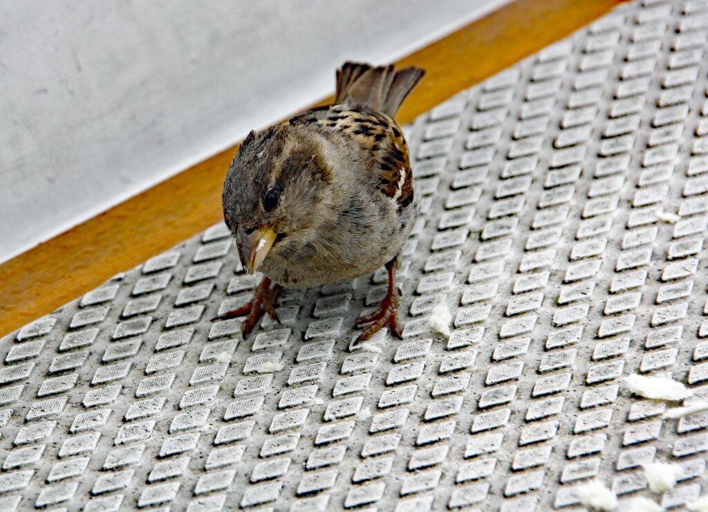 Ein kecker Spatz kommt bis ins Cockpit, um die letzten Reste von dem übrig gebliebenen Brötchen zu bekommen.