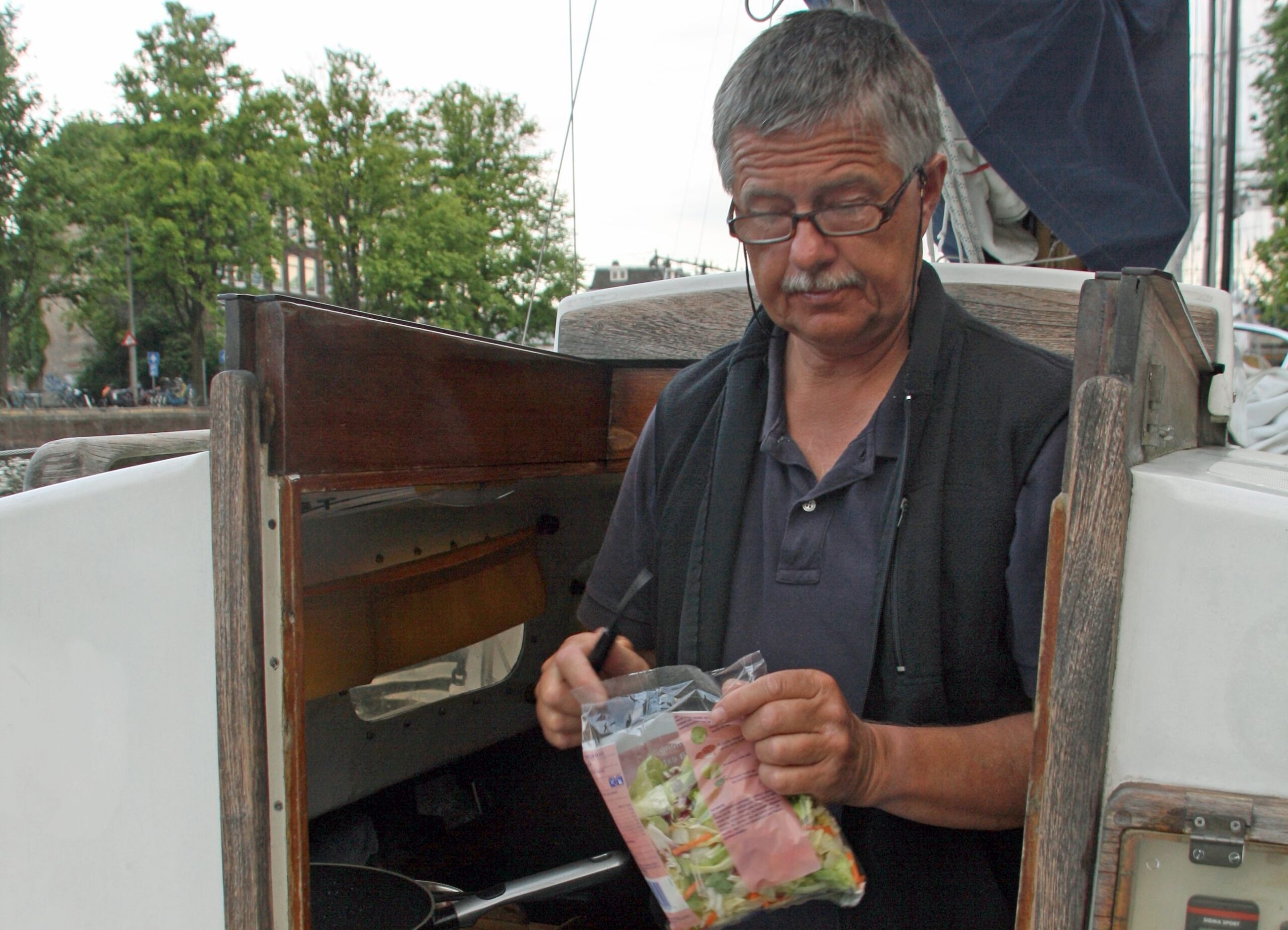 Cockpitzelt aufbauen, was uns inzwischen recht flott von der Hand geht. Dann machen wir einen Erkundungsgang durch Enkhuizen, und kaufen noch ein, nachdem wir auf der “Torenstraat” in der Nähe der Kirche mit dem markanten Turm einen “Aldi” gefunden haben.