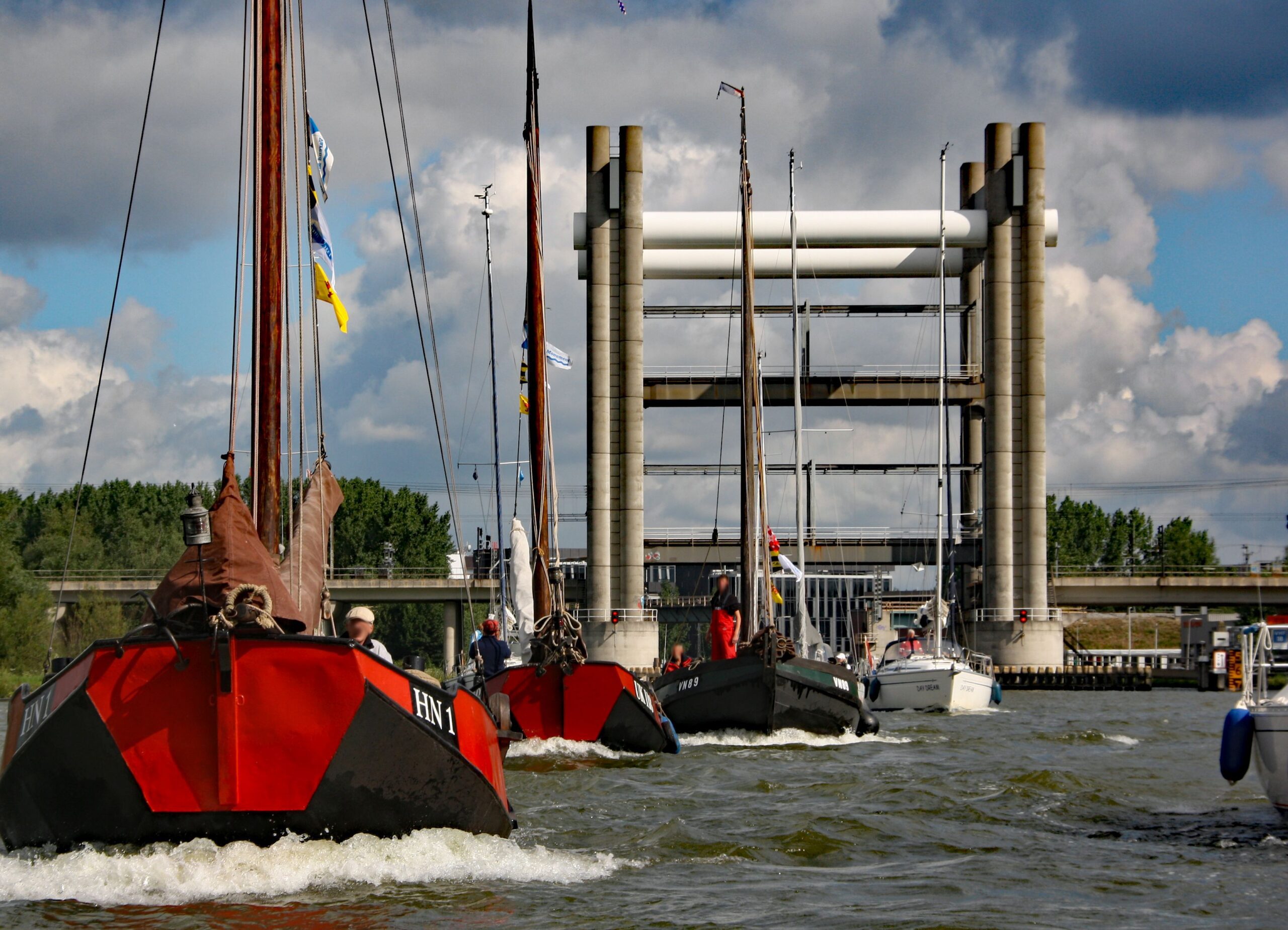 In der „Nieuwe Meersluis“ nach der Durchfahrt treffen wir auf 3 alte kleine Stahl-Plattboden, die früher als Fischerboote eingesetzt waren. Baujahre von ca. 1940 - 1949. Sie fahren nach Rotterdam zu einem Treffen mit ca. 200 alten Arbeitsseglern. Mit einem der Mitsegler haben wir ein sehr nettes Gespräch. Wir kommen als erste aus der Schleuse und führen nun den Konvoi an durch das „Nieuwe Meer“.