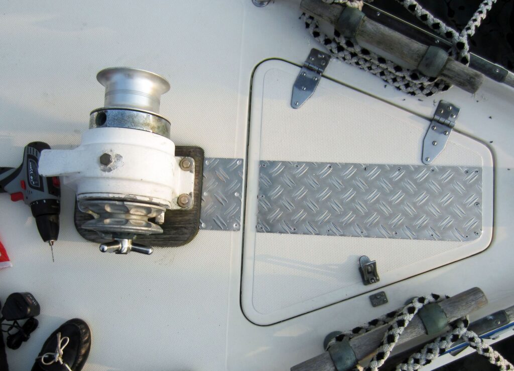 Die zu Hause gefertigten Aluplatten für den Bereich des Ankerkastens werden befestigt. Der neue 14 kg. Anker passt hervorragend durch den Bugspriet, was wir ehrlich gesagt auch erwartet hatten … aber man weiß ja nie genau, ob man nun auch wirklich richtig gemessen hat.