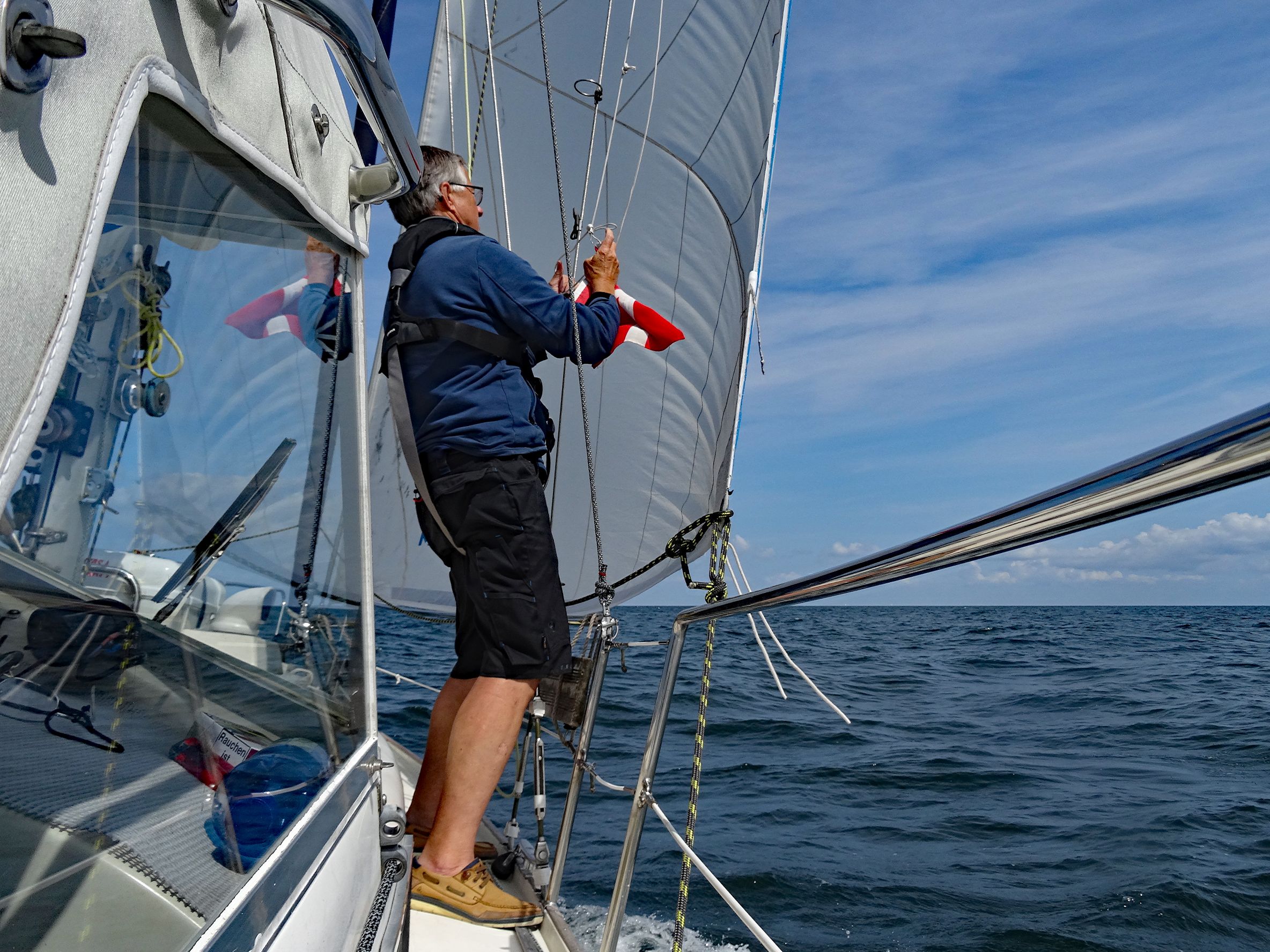 Gegen 12:30h machen wir den Motor aus. 2 Versuche, mit der ja nach vorne versetzten Genua eine Wende zu fahren und dabei die Genua zwischen den beiden Vorstagen auf die neue Leeseite zu ziehen, scheitern beide.