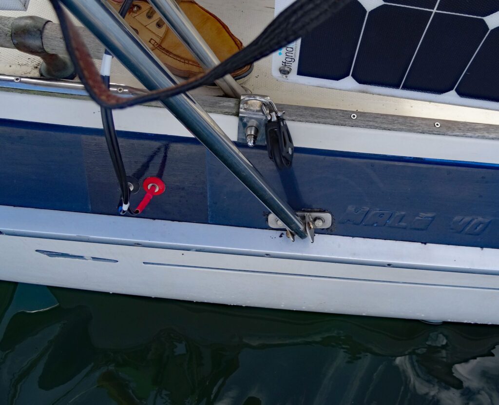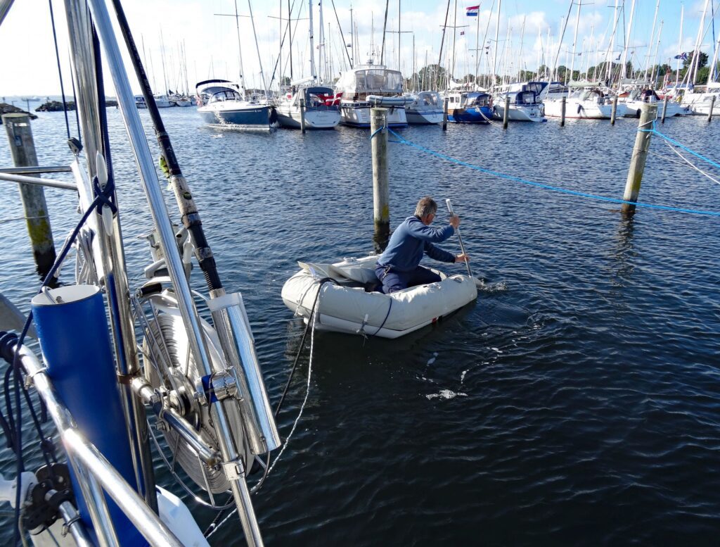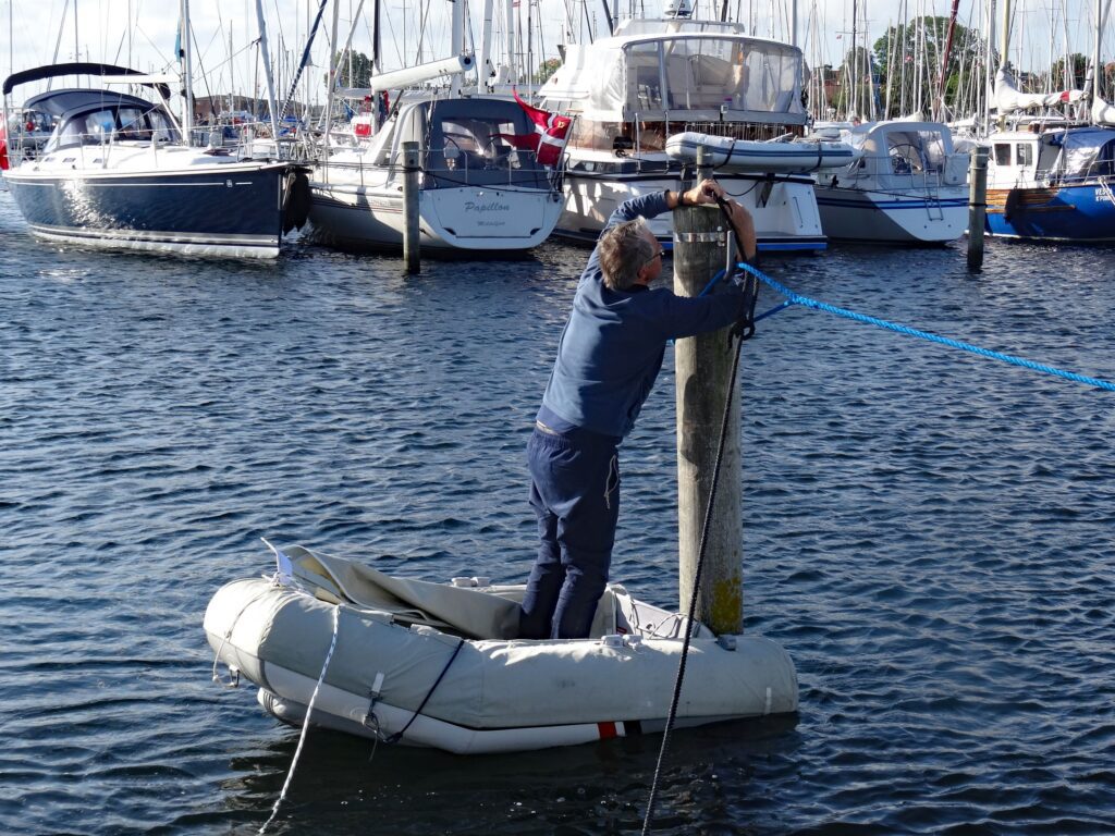 Beim Manövrieren kommen wir leider mit dem Schlauchboot an ein anderes Boot und die Bugschlaufe am Schlauchboot reißt ab. Ist aber leicht zu beheben, weil sich darunter die stärkere Schleppschlaufe (VA-Ring) befindet.