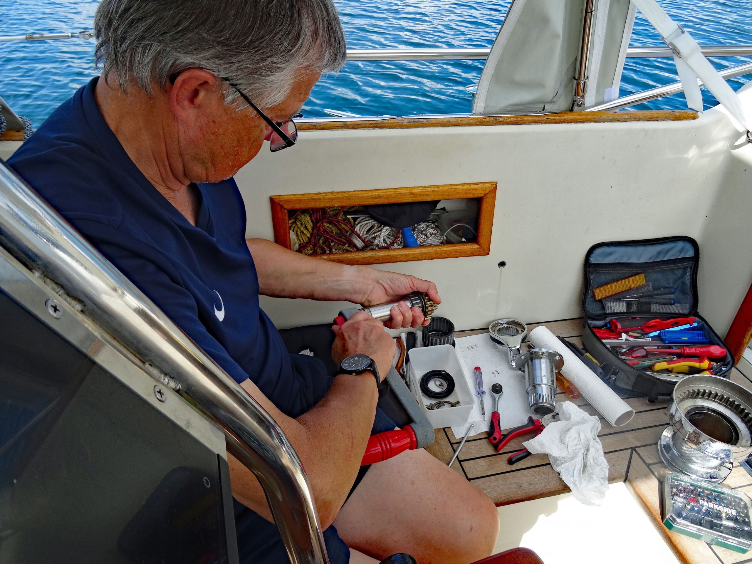 Am Nachmittag bei gutem Sommerwetter wird die Winsch auseinander genommen. Nach Prüfung und erneutem Zusammensetzen ergab sich als einzige Möglichkeit des Problems, dass offensichtlich 2 Zahnräder bei der letzten Wartung verkehrt herum eingesetzt worden waren.